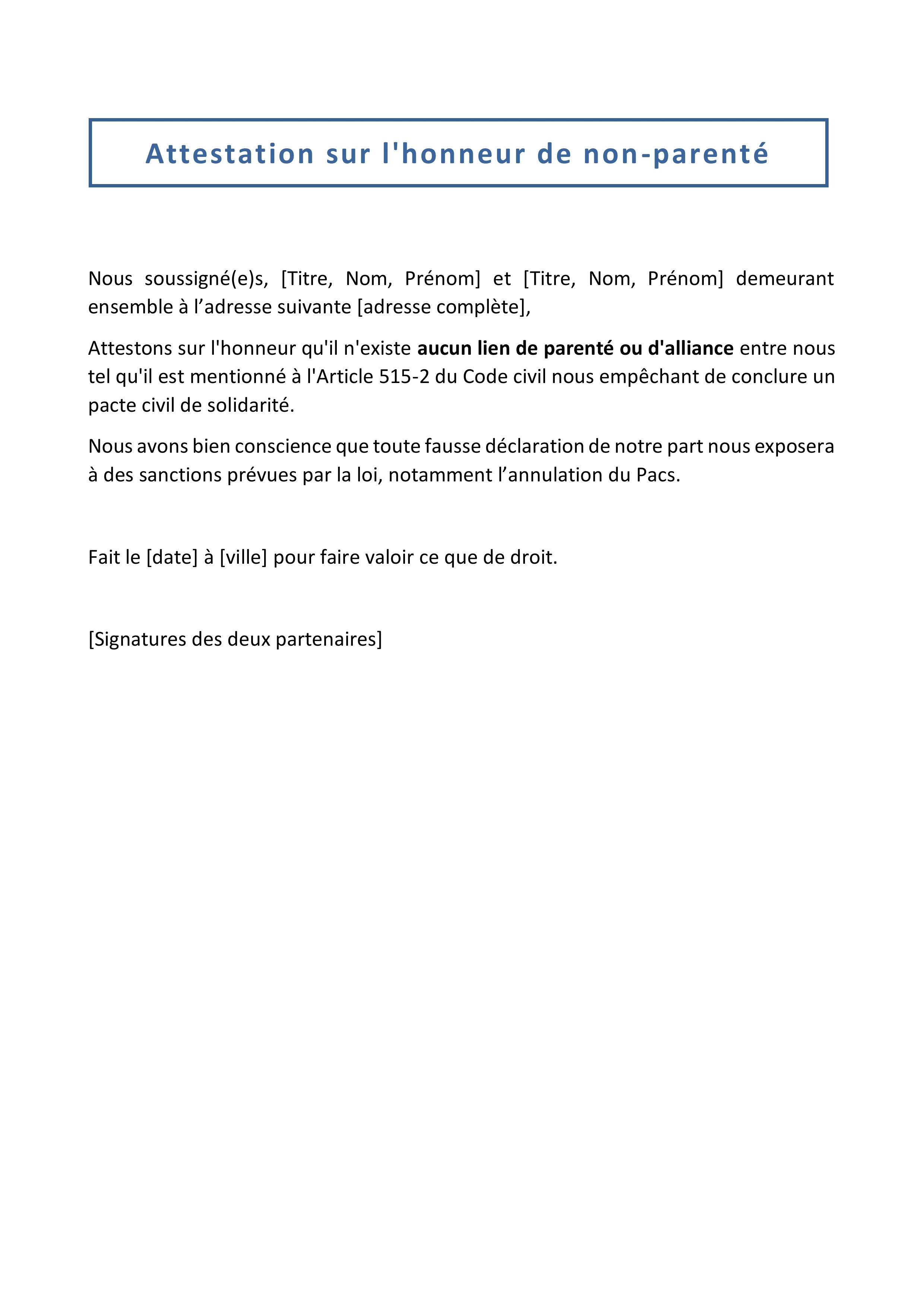 Attestons sur l'honneur qu'il n'existe aucun lien de parenté ou d'alliance entre nous tel qu'il est mentionné à l'Article 515-2 du Code civil nous empêchant de conclure un pacte civil de solidarité.