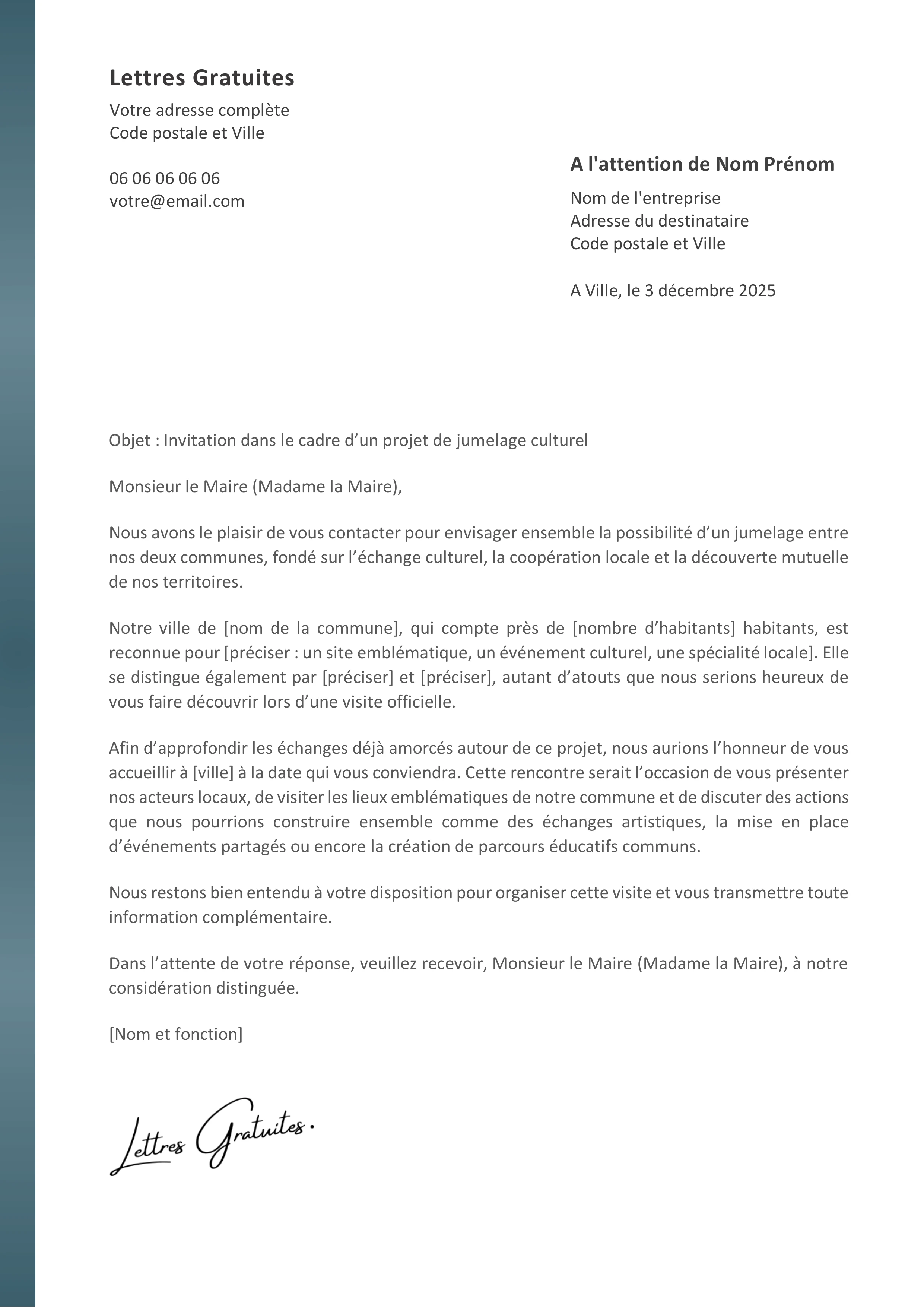 Ce modèle est idéal lorsqu’une commune souhaite accueillir les élus ou les responsables d’une ville partenaire afin d’explorer un jumelage à dimension culturelle. Le texte met en valeur le territoire, rappelle le sens de la démarche et propose une rencontre officielle pour ouvrir la voie à un partenariat durable.