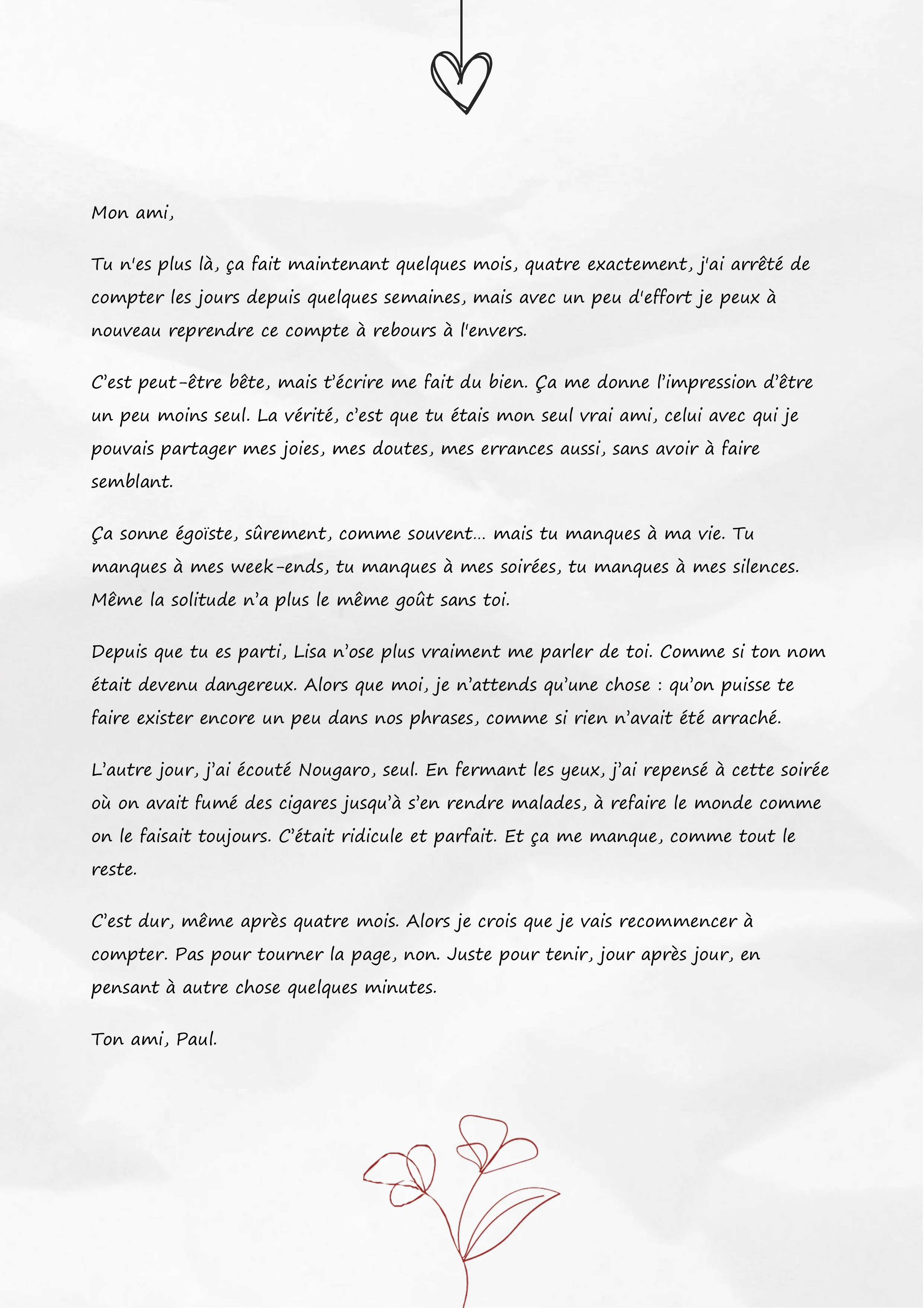 C’est peut-être bête, mais t’écrire me fait du bien. Ça me donne l’impression d’être un peu moins seul. La vérité, c’est que tu étais mon seul vrai ami, celui avec qui je pouvais partager mes joies, mes doutes, mes errances aussi, sans avoir à faire semblant.