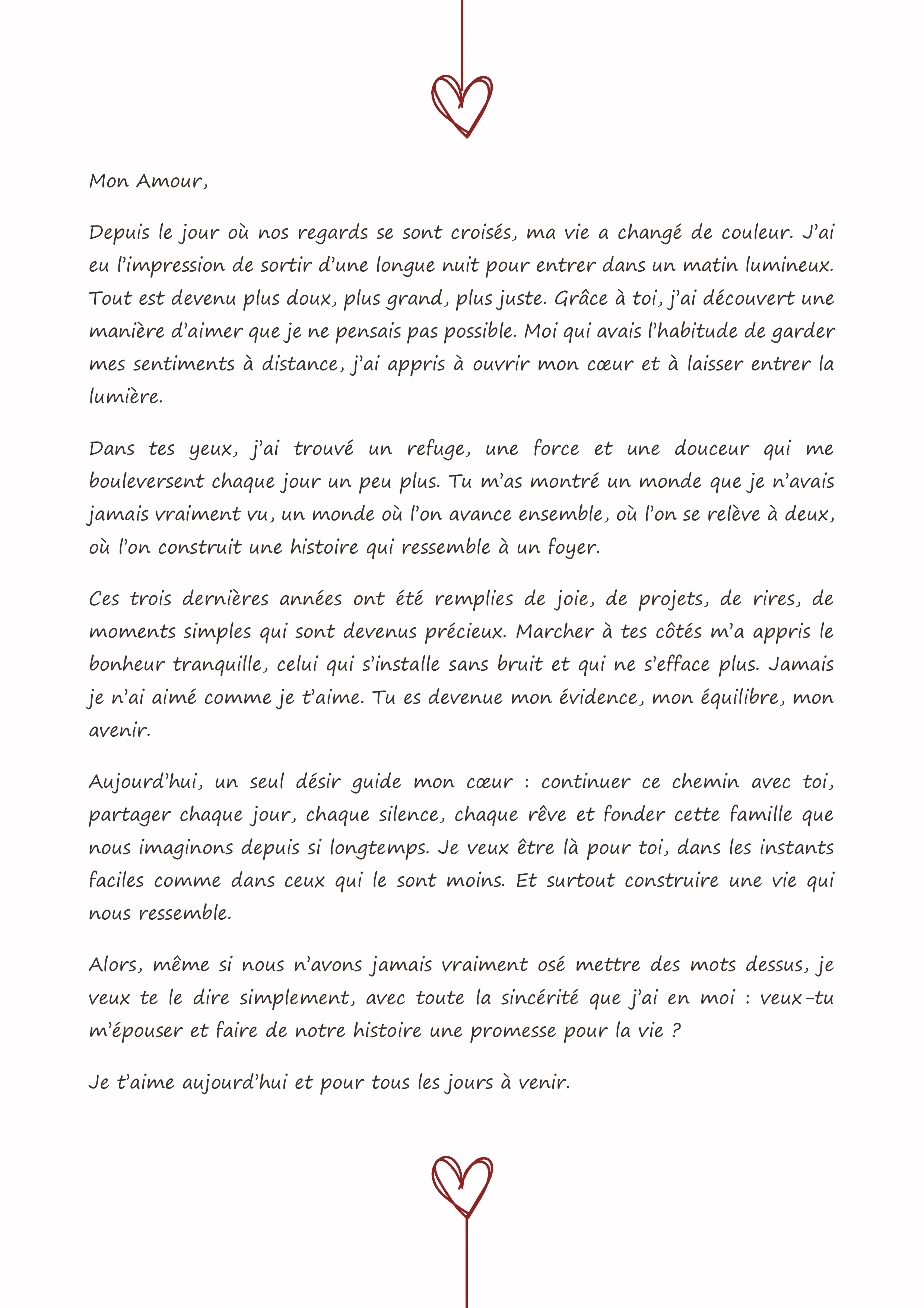 Alors, même si nous n’avons jamais vraiment osé mettre des mots dessus, je veux te le dire simplement, avec toute la sincérité que j’ai en moi : veux-tu m’épouser et faire de notre histoire une promesse pour la vie ?