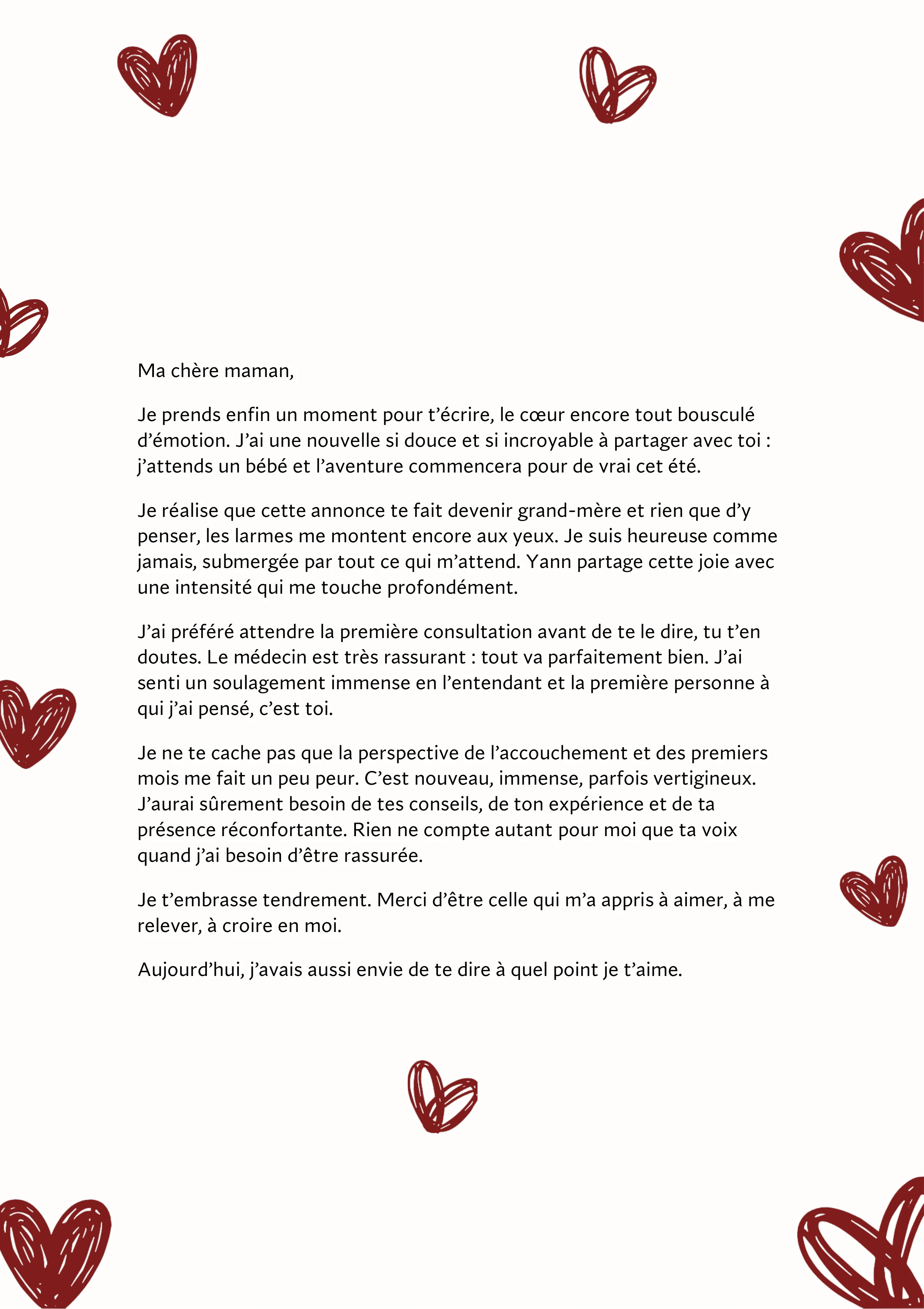 Dans les familles soudées, annoncer à ses parents qu'on est enceinte est souvent un moment chargé d’émotion. On a envie de partager sa joie, mais aussi ses doutes, ses craintes, son besoin d’être accompagné. Cette lettre est pensée pour une annonce intime, où l’on parle avec le cœur. Elle conviendra aussi bien pour une maman que pour un papa et peut être ajustée facilement en fonction de votre histoire personnelle.