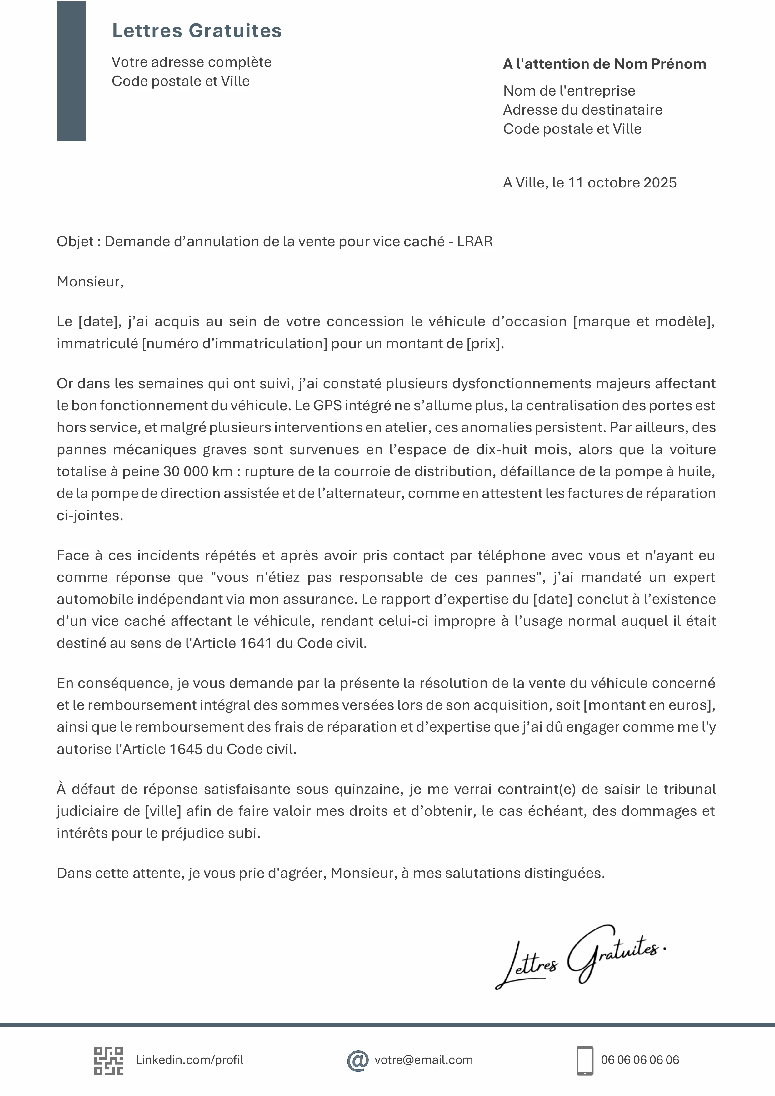 Lorsqu’un acheteur découvre que son véhicule récemment acquis présente des pannes graves récurrentes révélant un vice caché, il peut demander l’annulation de la vente et le remboursement du prix payé. Le modèle ci-dessous permet de formaliser cette démarche auprès du vendeur ou du concessionnaire concerné. Cette lettre peut être adaptée à tout type de bien vendu comportant un défaut non apparent lors de la vente.