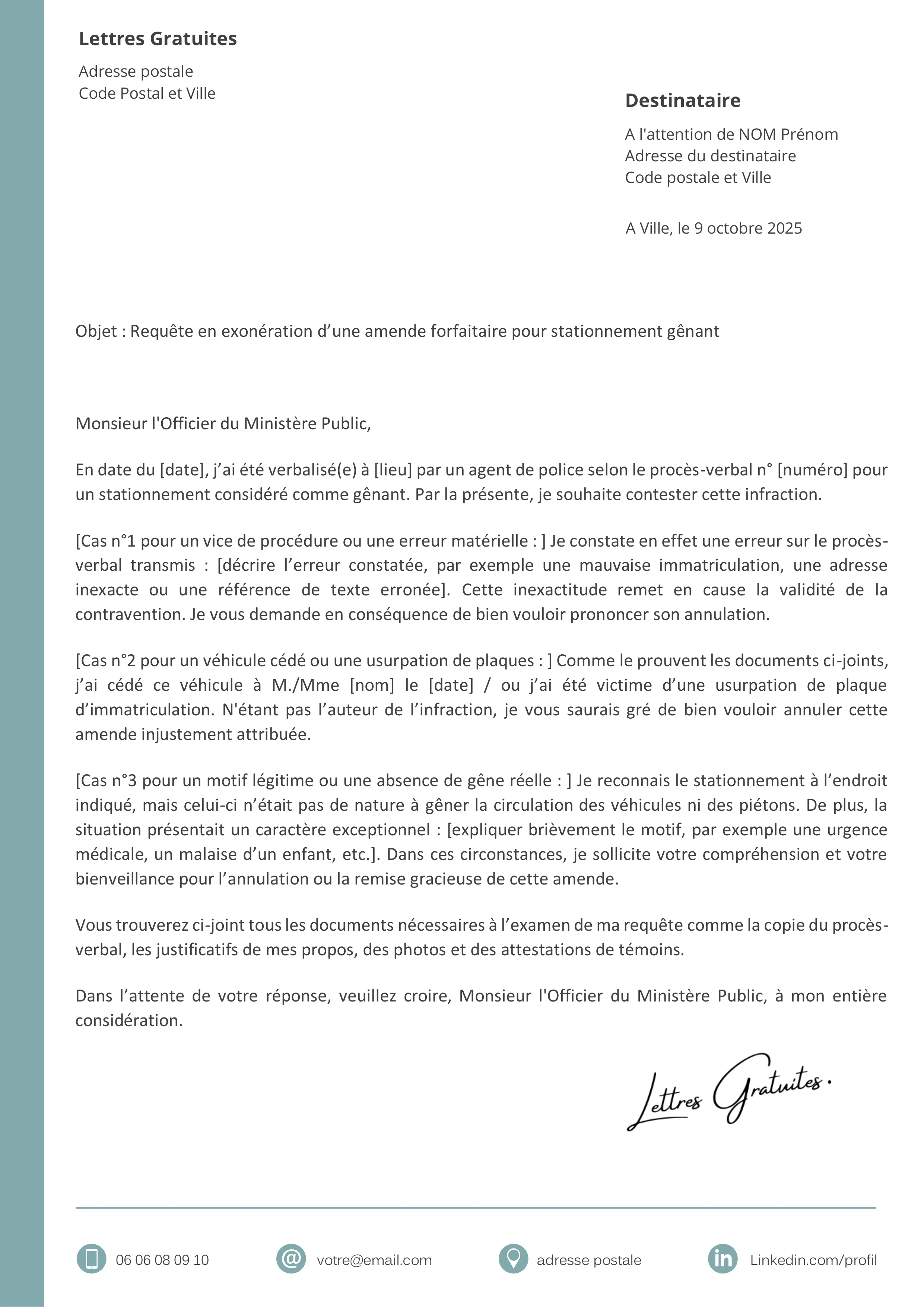 [Cas n°3 - Motif légitime ou absence de gêne réelle : ] Je reconnais le stationnement à l’endroit indiqué, mais celui-ci n’était pas de nature à gêner la circulation des véhicules ni des piétons. De plus, la situation présentait un caractère exceptionnel : [expliquer brièvement le motif, par exemple une urgence médicale, un malaise d’un enfant, etc.]. Dans ces circonstances, je sollicite votre compréhension et votre bienveillance pour l’annulation ou la remise gracieuse de cette amende.