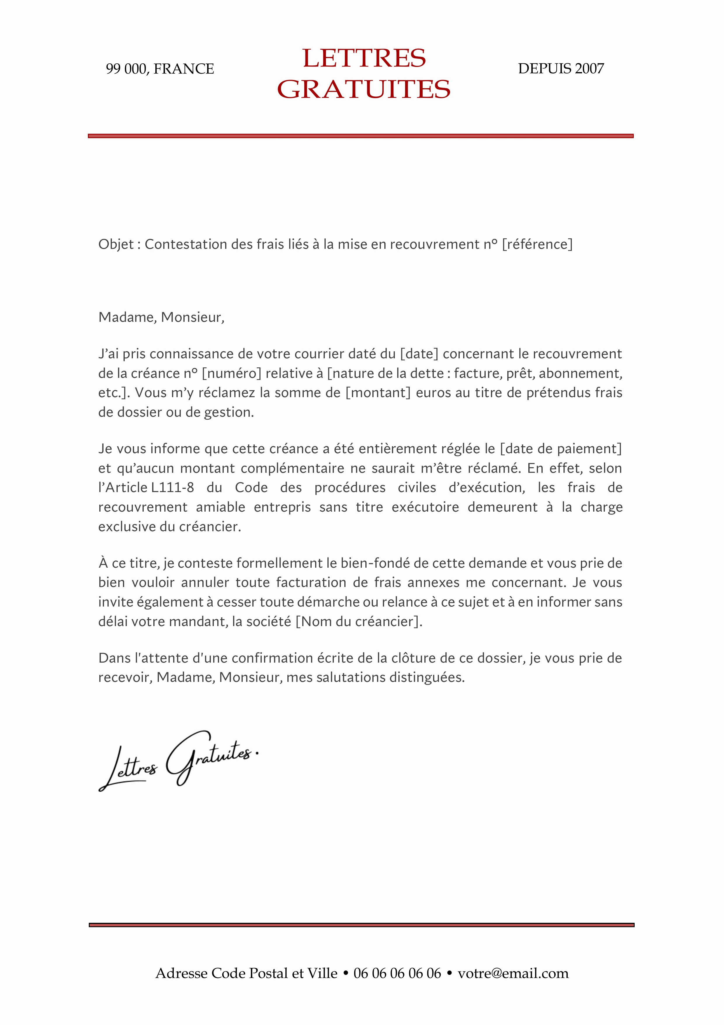 À ce titre, je conteste formellement le bien-fondé de cette demande et vous prie de bien vouloir annuler toute facturation de frais annexes me concernant. Je vous invite également à cesser toute démarche ou relance à ce sujet et à en informer sans délai votre mandant, la société [Nom du créancier].