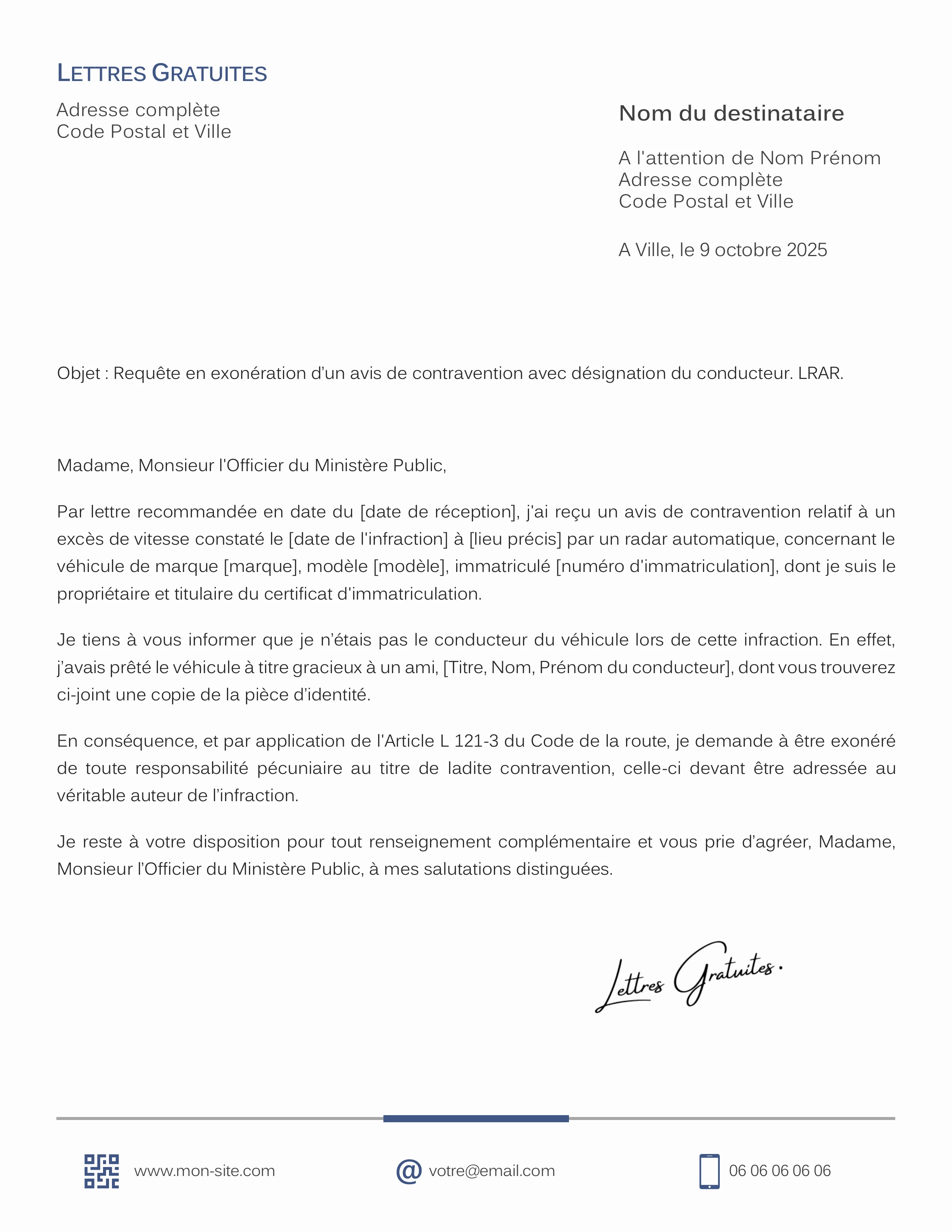Objet : Requête en exonération d’un avis de contravention avec désignation du conducteur. LRAR.