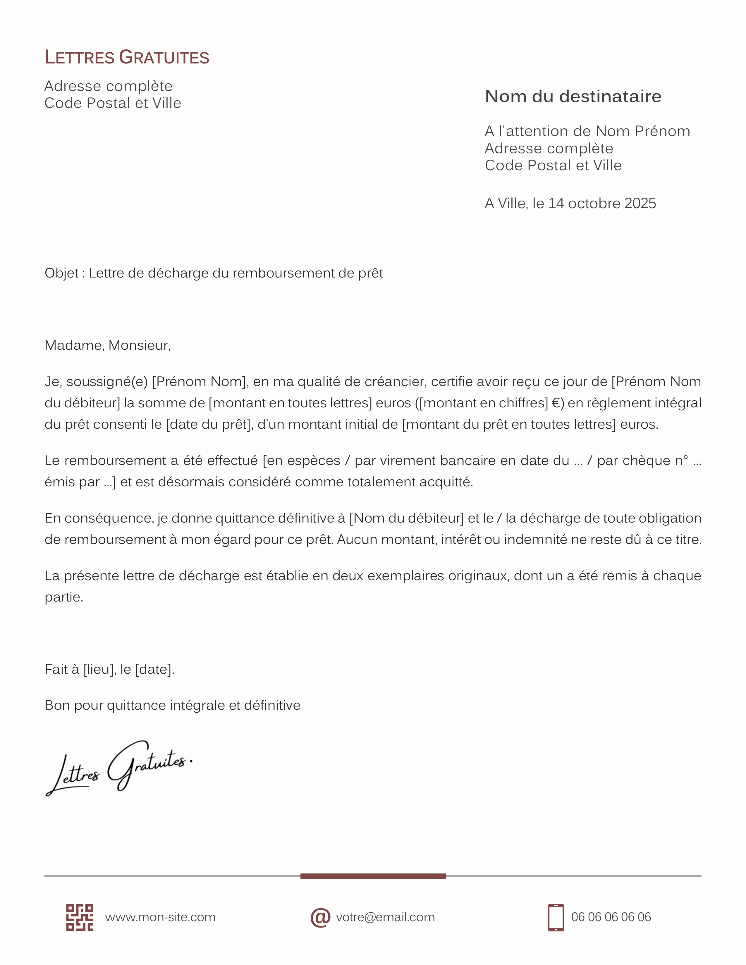 En conséquence, je donne quittance définitive à [Nom du débiteur] et le / la décharge de toute obligation de remboursement à mon égard pour ce prêt. Aucun montant, intérêt ou indemnité ne reste dû à ce titre.