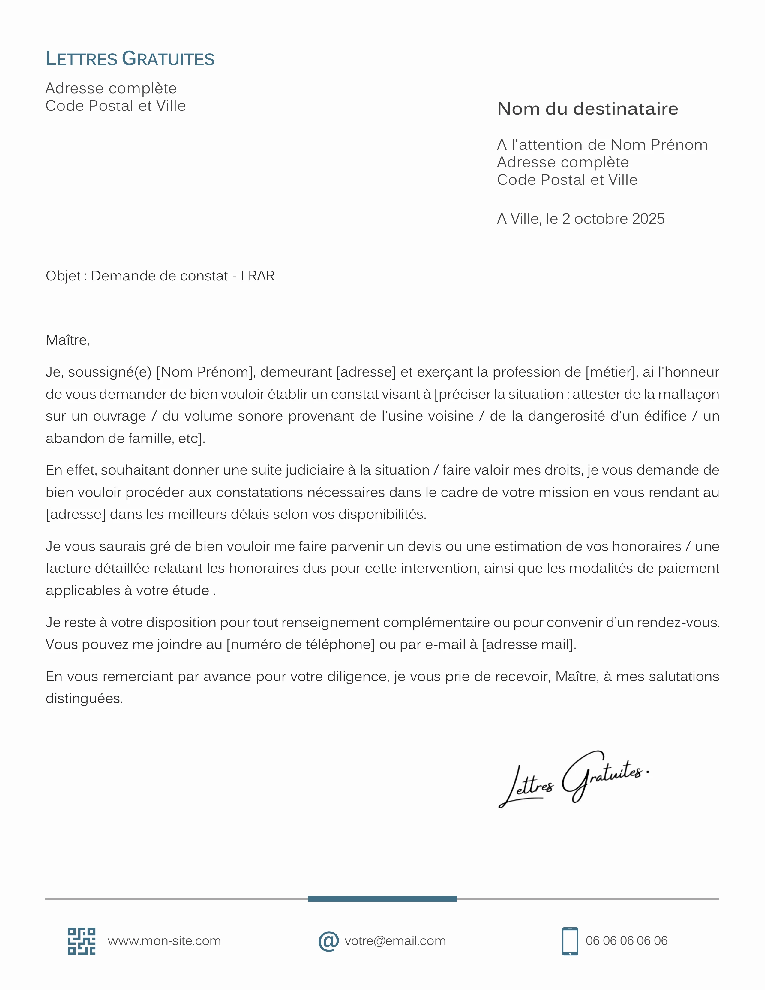 Je, soussigné(e) [Nom Prénom], demeurant [adresse] et exerçant la profession de [métier], ai l'honneur de vous demander de bien vouloir établir un constat visant à [préciser la situation : attester de la malfaçon sur un ouvrage / du volume sonore provenant de l'usine voisine / de la dangerosité d'un édifice / un abandon de famille, etc].