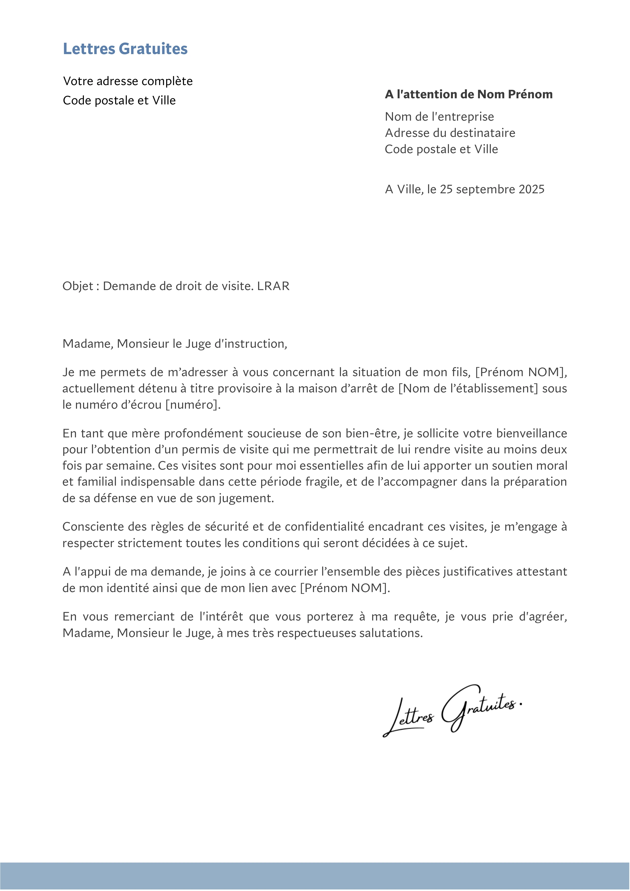 Cette lettre est destinée à une demande de permis de visite adressée au juge d’instruction en charge du dossier d’une personne en détention provisoire. Elle s’appuie sur le lien familial direct avec le prévenu et met en avant la volonté de soutenir moralement et psychologiquement ce dernier durant la procédure. Ce modèle peut être adapté selon la nature de la relation (conjoint, frère, sœur, petit ami, etc).