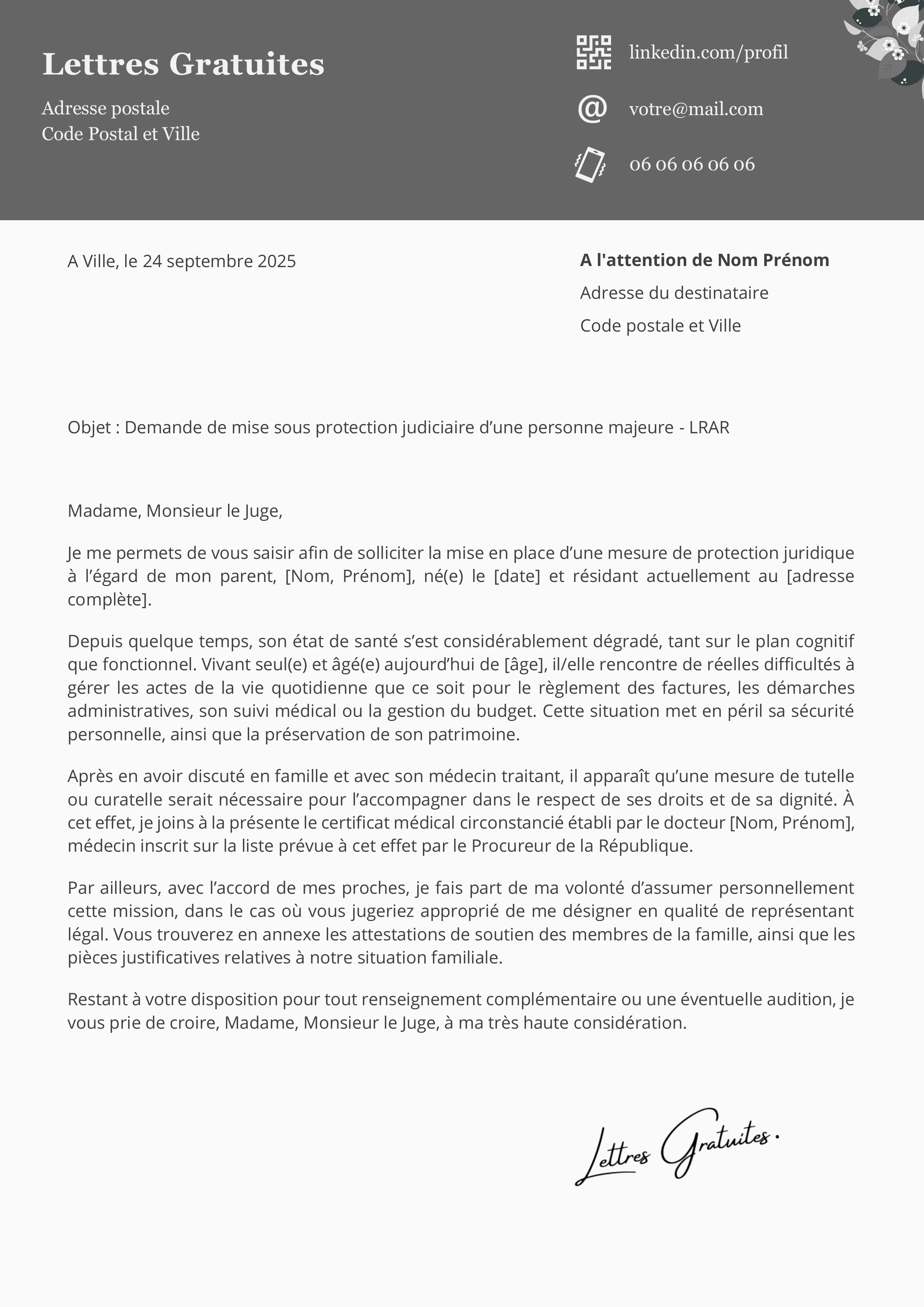 Ce modèle de lettre permet à un membre de la famille de solliciter auprès du juge des contentieux de la protection une mesure de protection juridique pour un parent en situation de vulnérabilité, qu’il s’agisse d’une tutelle, d’une curatelle ou d’une sauvegarde de justice. Le courrier expose les faits justifiant la demande, précise les souhaits de la famille quant à la désignation du représentant légal, et s’accompagne des pièces requises comme le certificat médical circonstancié. Il peut être adapté à différents cas de figure : âge, pathologie, isolement, désorganisation de la vie quotidienne, etc.