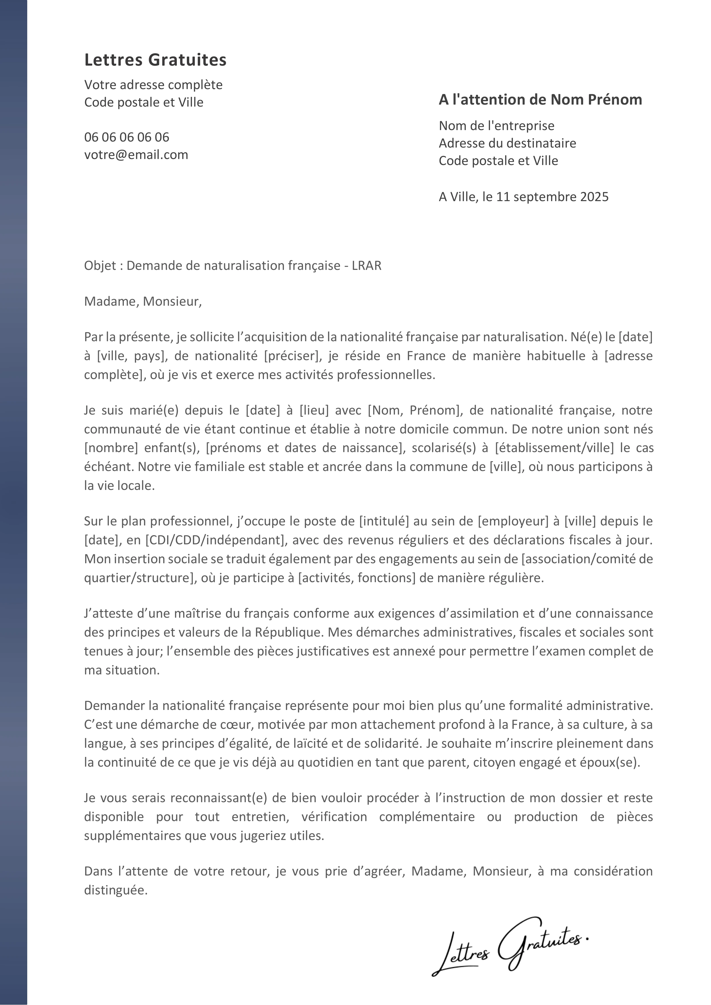 Ce modèle de lettre est destiné aux personnes souhaitant obtenir la nationalité française après un mariage avec un(e) conjoint(e) français(e). Dans ce cas, la demande peut être introduite par déclaration, sous réserve de remplir certaines conditions de durée de mariage, de communauté de vie et de résidence en France. La lettre permet d’exprimer votre volonté d’intégrer pleinement la communauté nationale, de présenter votre parcours personnel, familial et professionnel, et de démontrer votre attachement aux valeurs de la République.