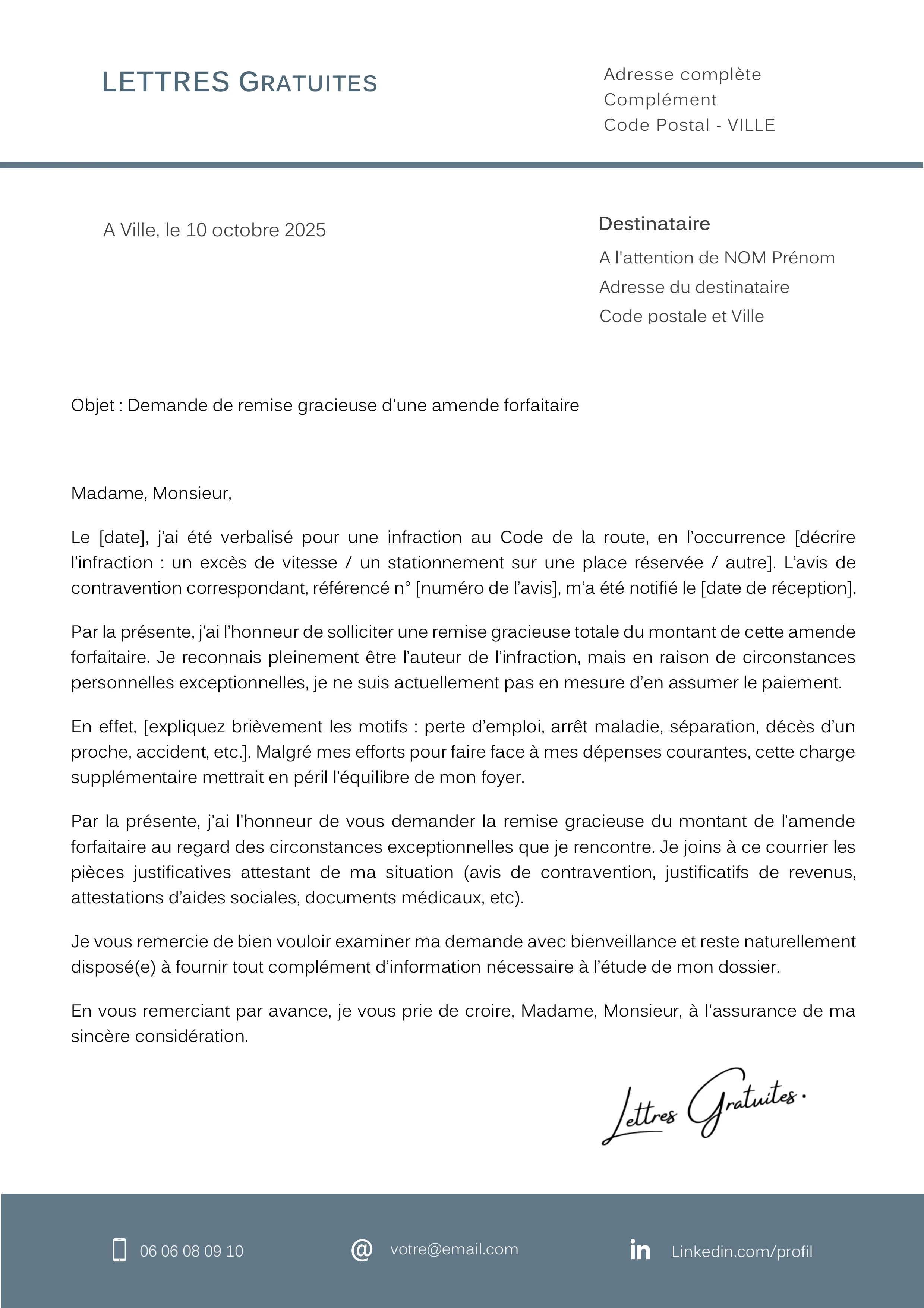 Par la présente, j'ai l'honneur de vous demander la remise gracieuse du montant de l’amende forfaitaire au regard des circonstances exceptionnelles que je rencontre. Je joins à ce courrier les pièces justificatives attestant de ma situation (avis de contravention, justificatifs de revenus, attestations d’aides sociales, documents médicaux, etc).