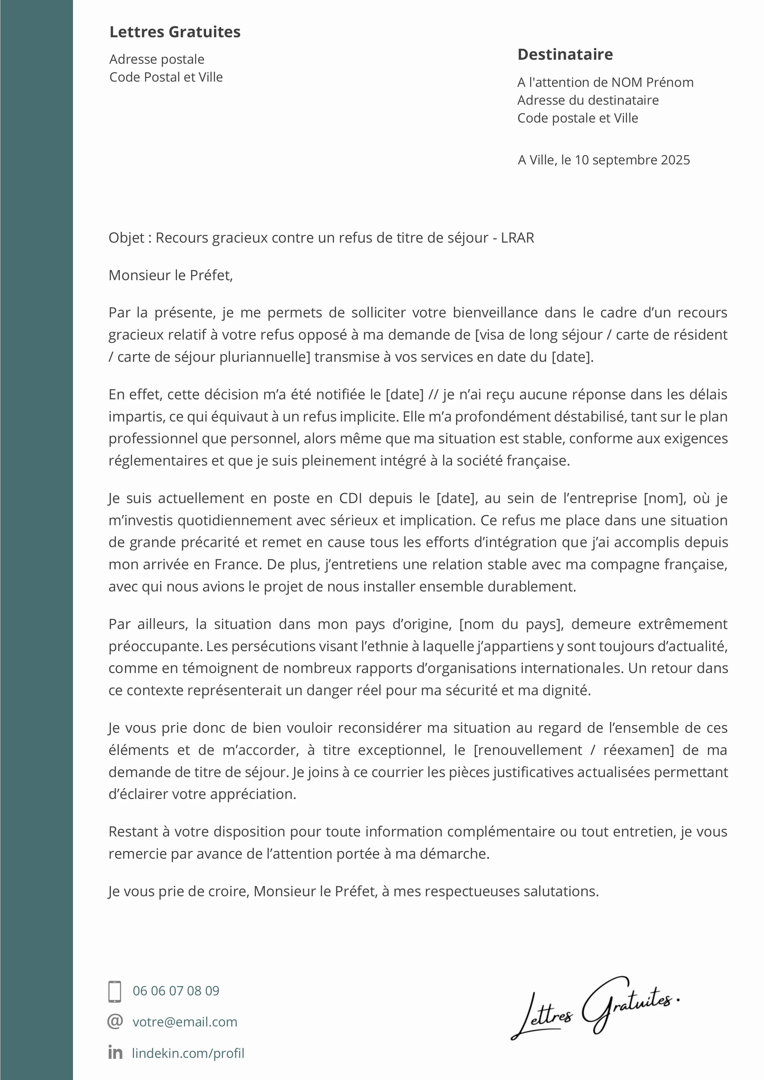Ce modèle de lettre a été rédigé dans le cadre d’un recours gracieux adressé au préfet après le refus d’un visa de long séjour ou d’une carte de résident en France. Qu’il s’agisse d’un rejet explicite ou d’un refus implicite en l'absence de réponse dans les délais, cette lettre permet de faire valoir des éléments personnels, professionnels ou humanitaires afin de solliciter un réexamen bienveillant du dossier.