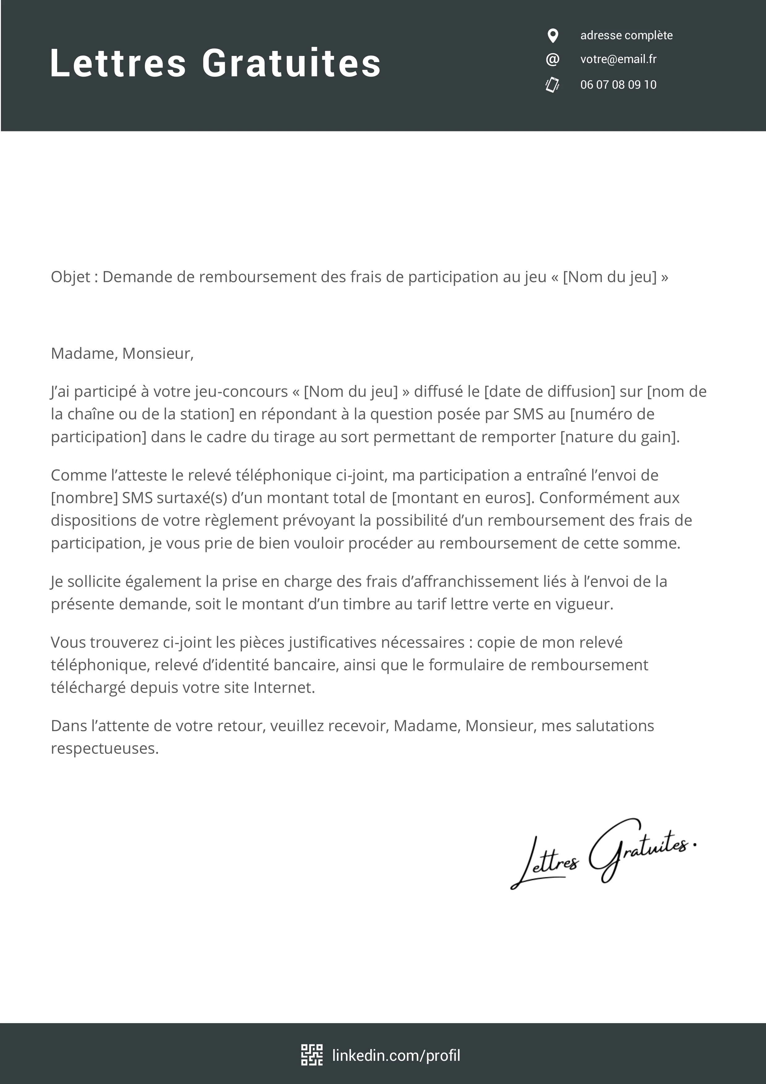Comme l’atteste le relevé téléphonique ci-joint, ma participation a entraîné l’envoi de [nombre] SMS surtaxé(s) d’un montant total de [montant en euros]. Conformément aux dispositions de votre règlement prévoyant la possibilité d’un remboursement des frais de participation, je vous prie de bien vouloir procéder au remboursement de cette somme.