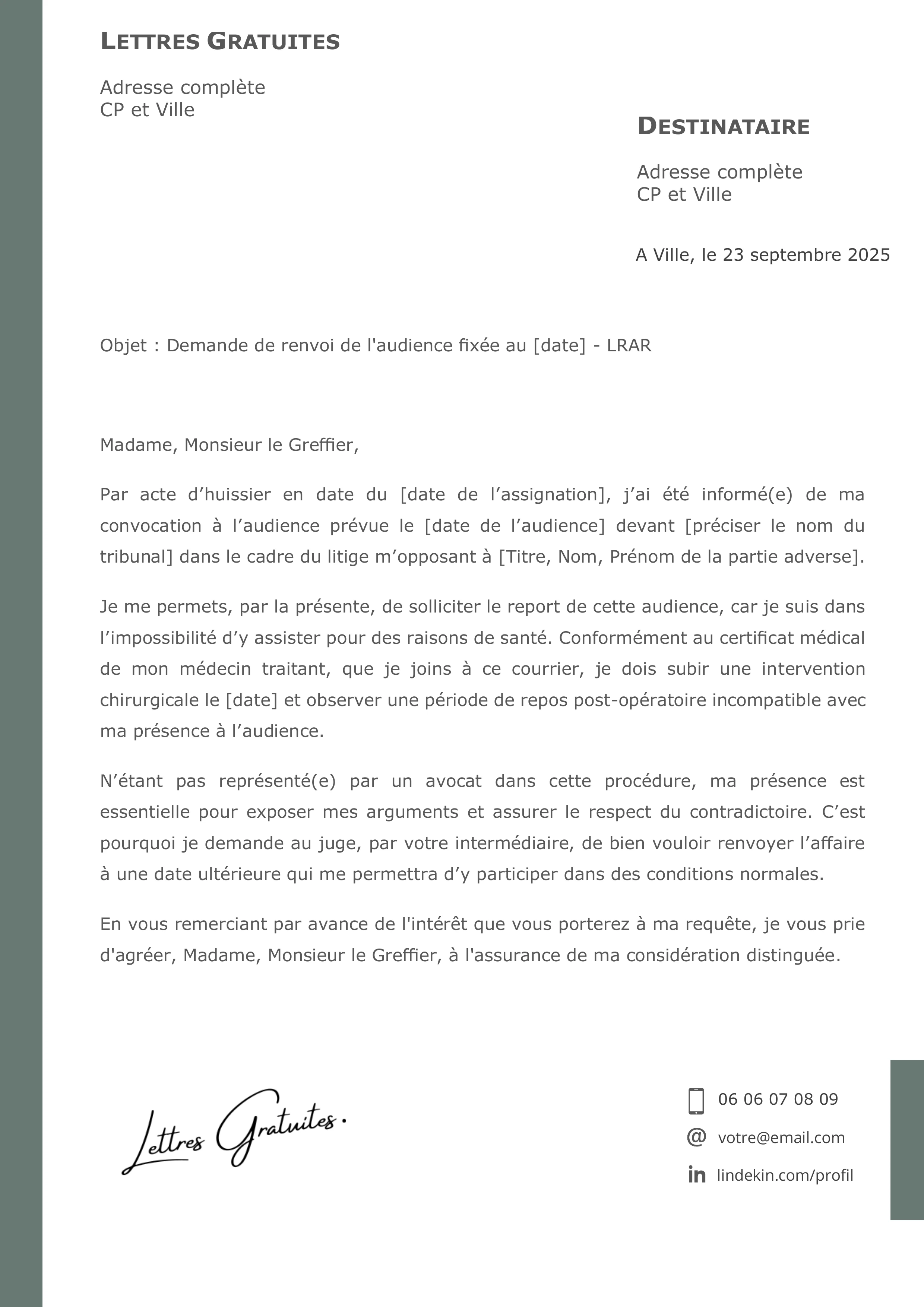 Dans le cadre d’une procédure judiciaire, il est possible de solliciter le report d’une audience lorsque l’on est dans l’incapacité d’y assister pour un motif sérieux comme une hospitalisation ou une convalescence. Le modèle de lettre ci-dessous peut être utilisé devant un tribunal judiciaire, un juge aux affaires familiales ou une juridiction civile, dès lors que l'affaire n’est pas soumise à une procédure accélérée ou d’urgence.