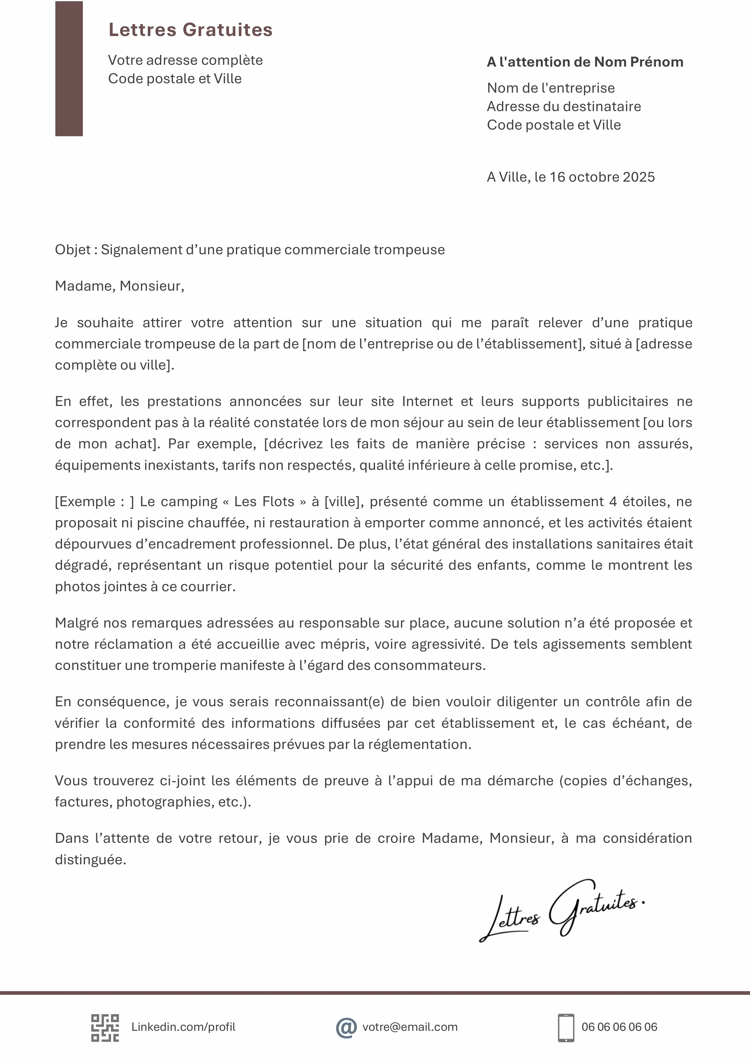 Lorsque vous êtes victime d’une publicité trompeuse, d’une fausse promotion ou d’une promesse commerciale mensongère, il est tout à fait légitime d’en informer la DGCCRF. Ce modèle de lettre vous aidera à formaliser votre signalement afin de permettre à l’administration d’évaluer la situation en expliquant les faits avec des preuves à l’appui.