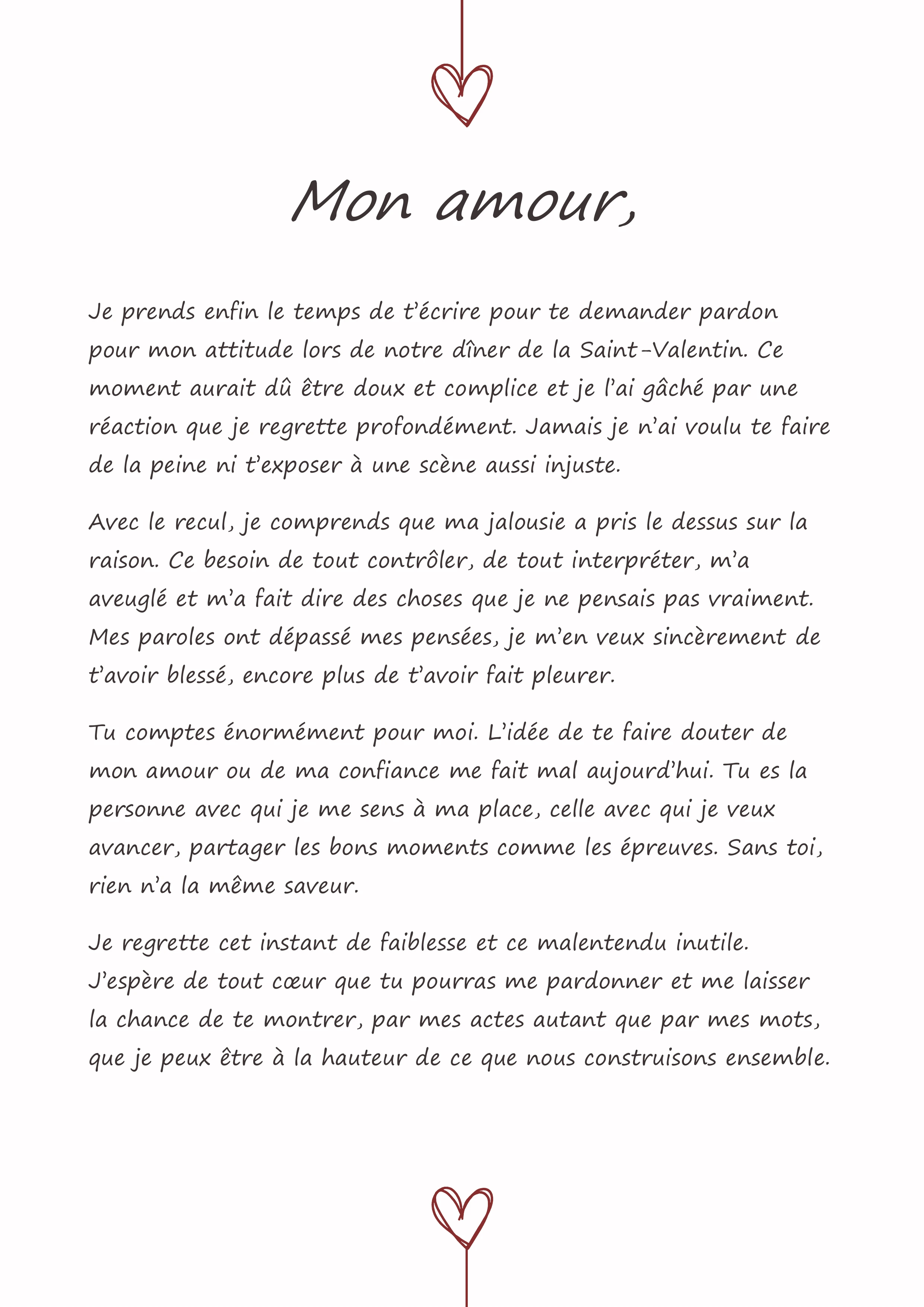 Je prends enfin le temps de t’écrire pour te demander pardon pour mon attitude lors de notre dîner de la Saint-Valentin. Ce moment aurait dû être doux et complice et je l’ai gâché par une réaction que je regrette profondément. Jamais je n’ai voulu te faire de la peine ni t’exposer à une scène aussi injuste.