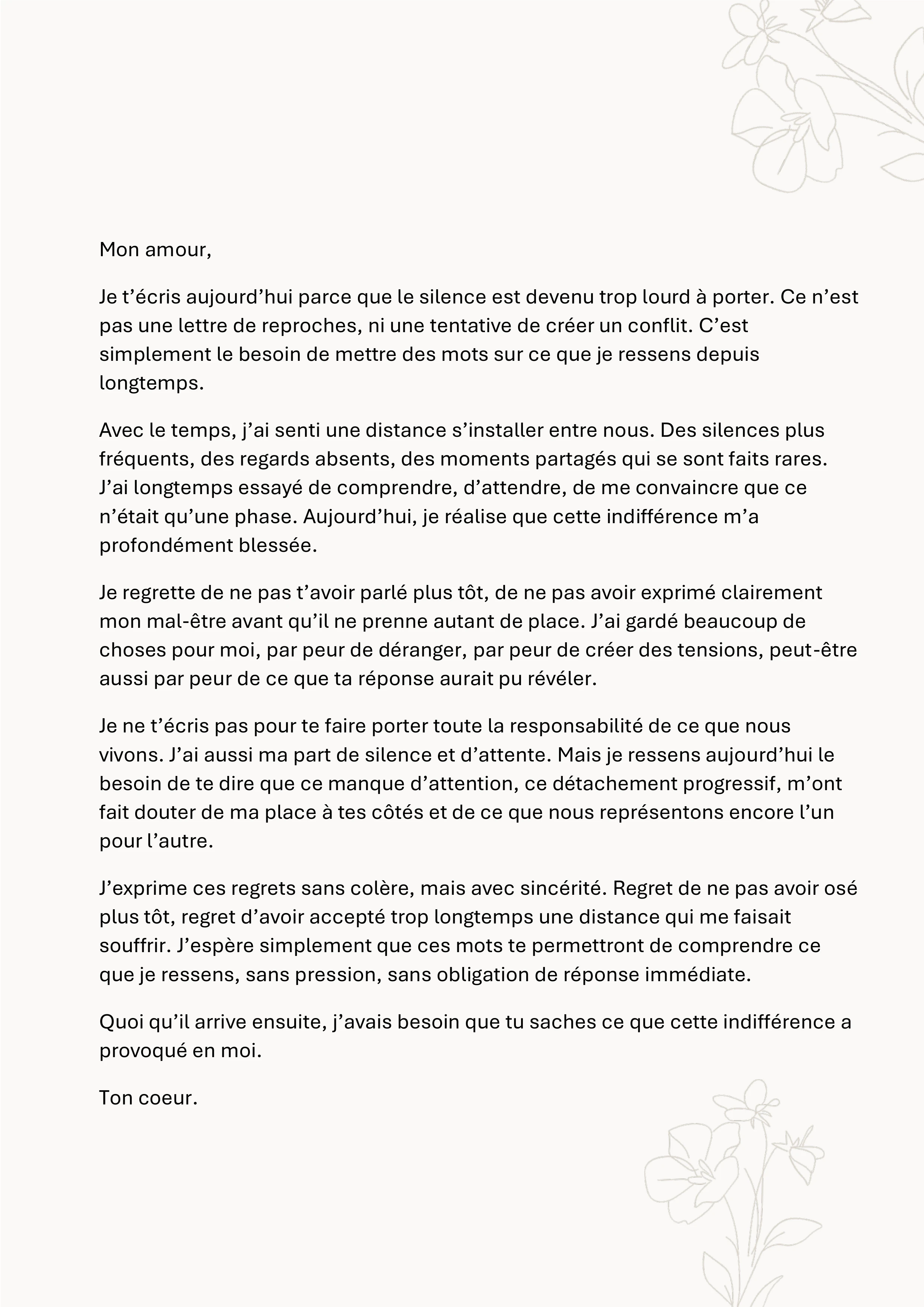 Cette lettre s’adresse à une femme qui se sent mise à distance par son mari, non pas à la suite d’un conflit précis, mais à cause d’une indifférence installée avec le temps. Elle exprime des regrets mêlés de déception, sans agressivité ni reproches directs. Le ton est posé, sincère, parfois douloureux, mais toujours respectueux. Cette lettre permet de dire ce que le silence et le manque d’attention ont provoqué, tout en laissant à l’autre la liberté d’entendre ou non ce message.