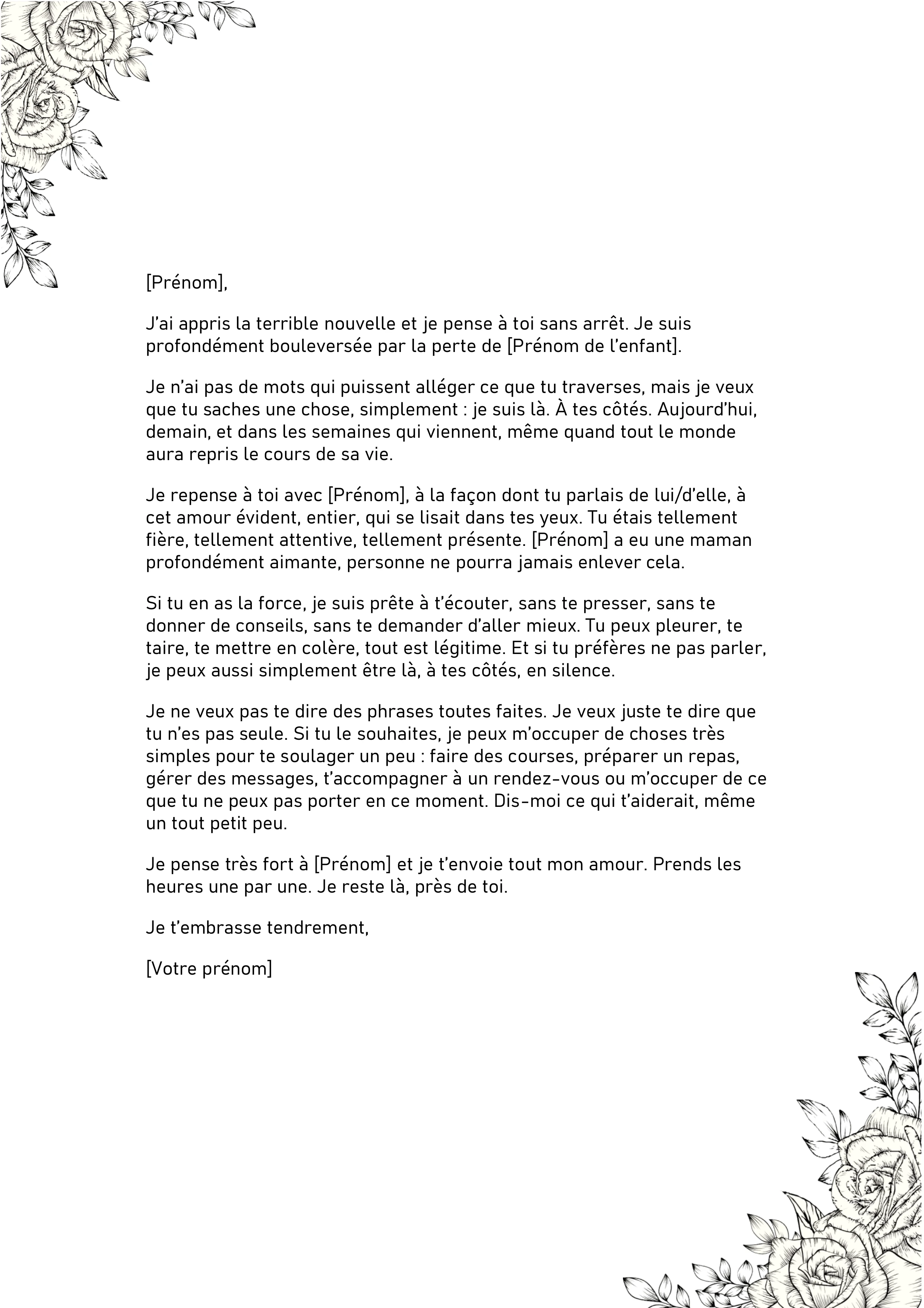 Cette lettre de condoléances est pensée pour une amie proche, une maman, qui vient de perdre son enfant. Elle adopte un ton intime et réconfortant, sans chercher à “combler le vide” par des phrases toutes faites. Pour qu’elle sonne juste, personnalisez-la avec le prénom de l’enfant et adaptez son contenu en fonction de la relation que vous avez avec la personne.