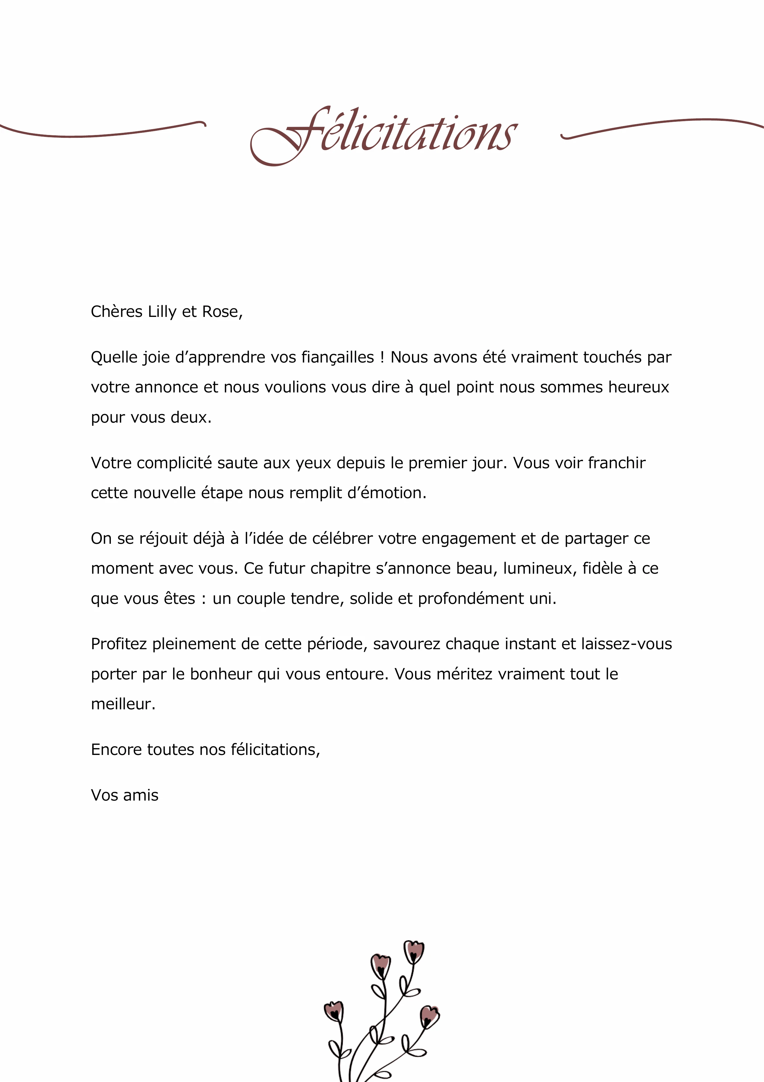 Voici un exemple de message pour répondre à l’annonce des fiançailles d’amis proches. Ce texte convient bien pour un mail, une carte ou un petit mot glissé avec un cadeau. Le ton est chaleureux, personnel, et met l’accent sur la complicité du couple et la joie de partager cette nouvelle étape avec elles.