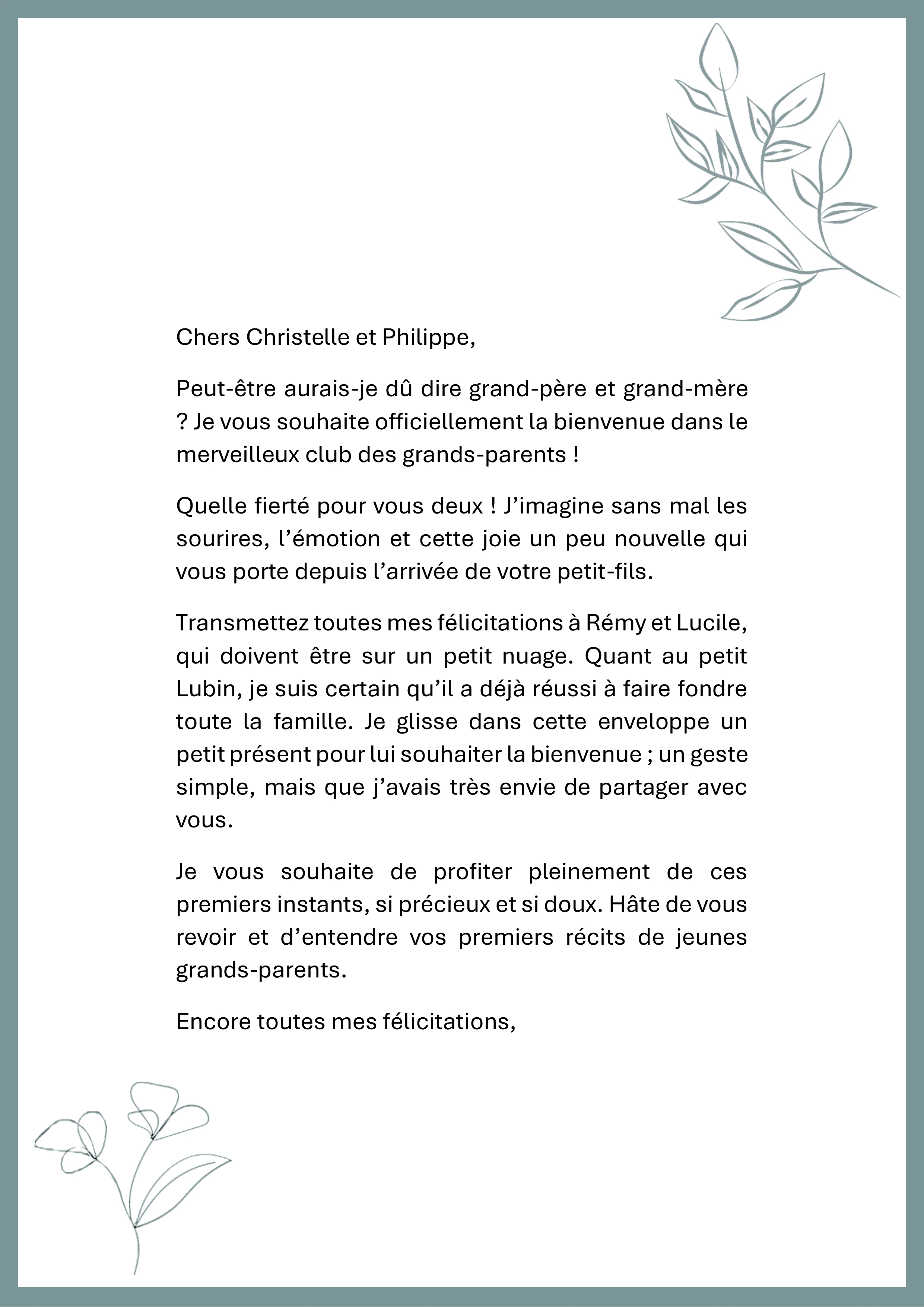 Transmettez toutes mes félicitations à Rémy et Lucile, qui doivent être sur un petit nuage. Quant au petit Lubin, je suis certain qu’il a déjà réussi à faire fondre toute la famille. Je glisse dans cette enveloppe un petit présent pour lui souhaiter la bienvenue ; un geste simple, mais que j’avais très envie de partager avec vous.