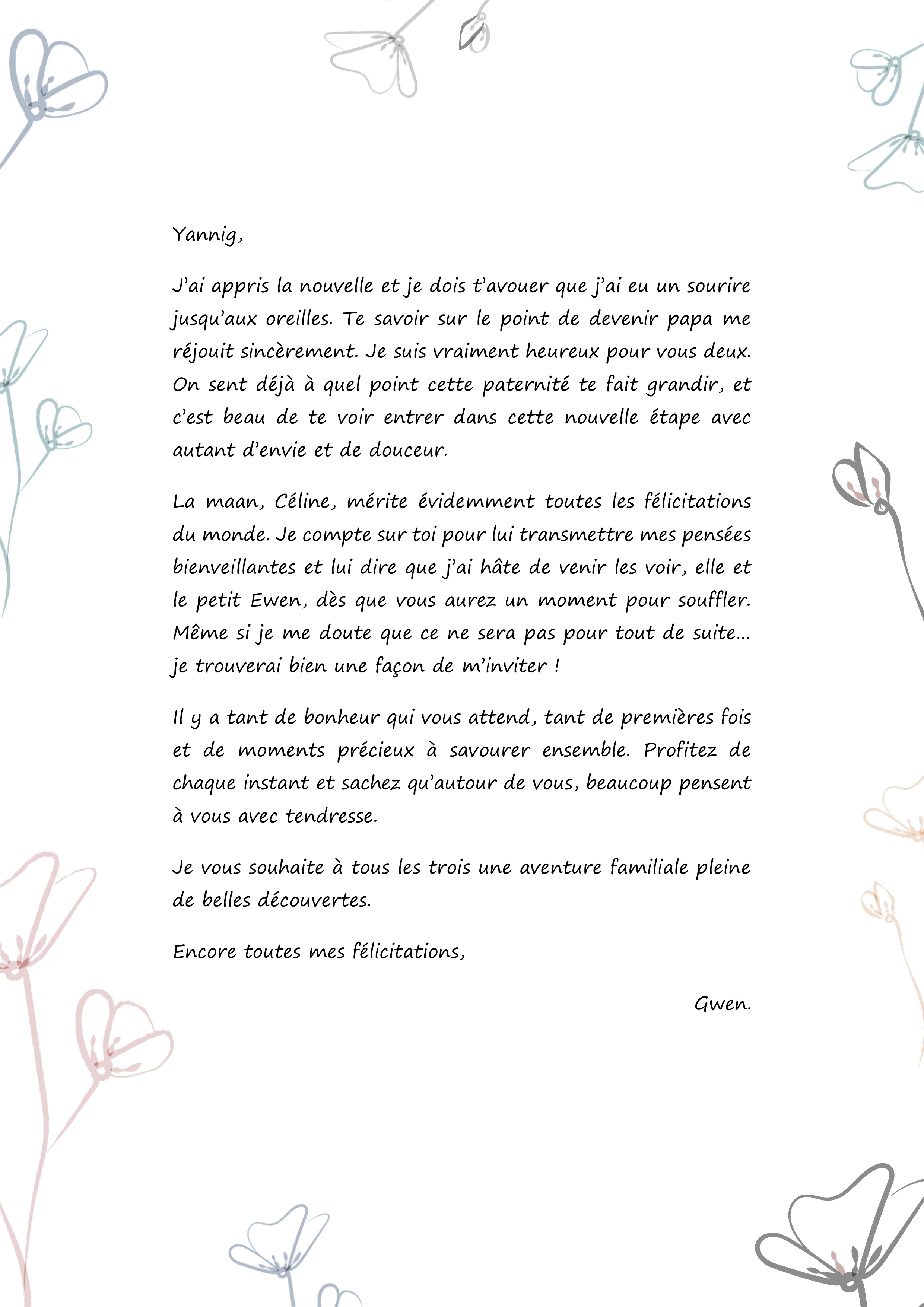 Vous pouvez aussi vous inspirer de notre exemple de félicitations pour la naissance de jumeaux ou d'un premier enfant