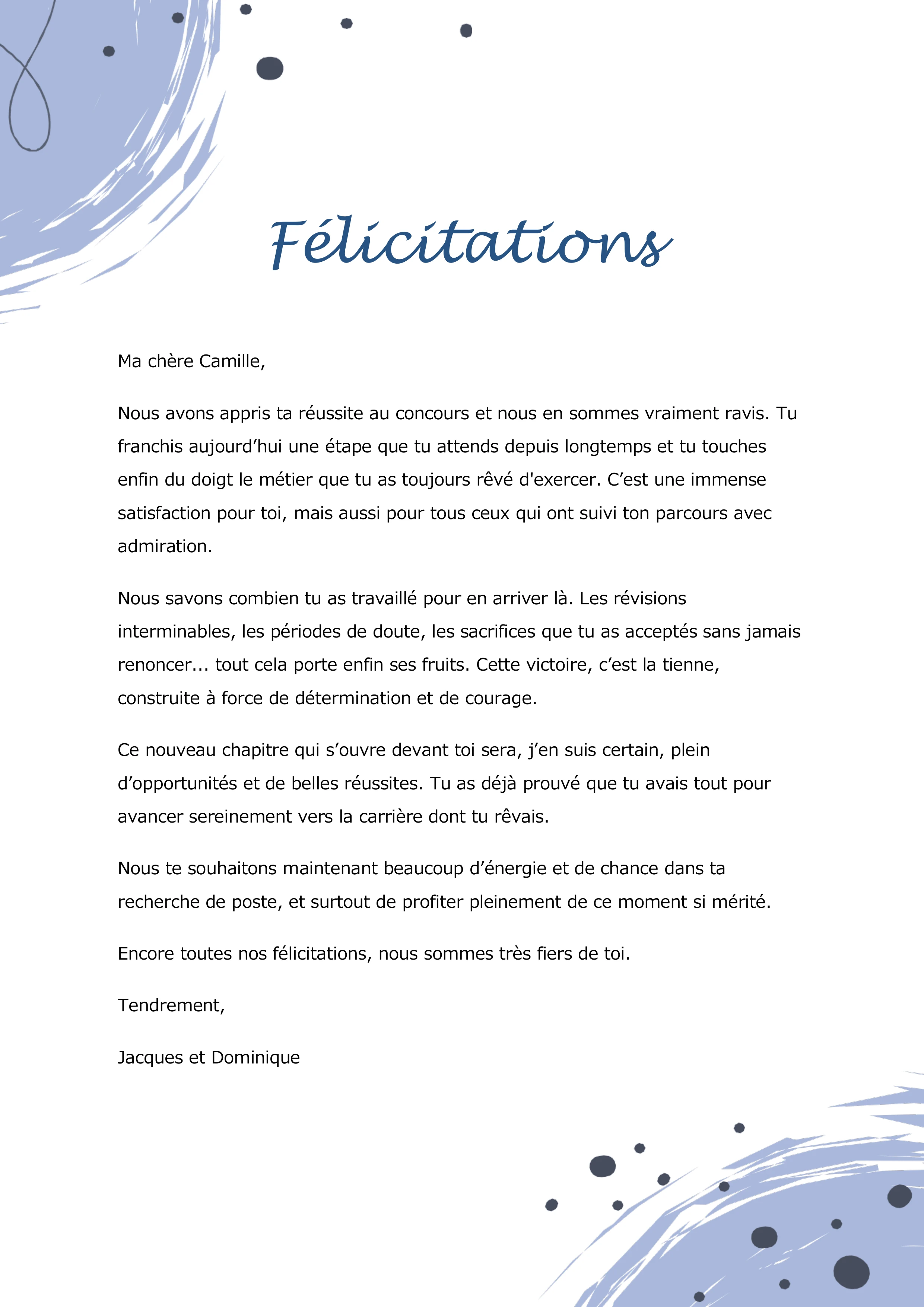 Nous avons appris ta réussite au concours et nous en sommes vraiment ravis. Tu franchis aujourd’hui une étape que tu attends depuis longtemps et tu touches enfin du doigt le métier que tu as toujours rêvé d'exercer. C’est une immense satisfaction pour toi, mais aussi pour tous ceux qui ont suivi ton parcours avec admiration.