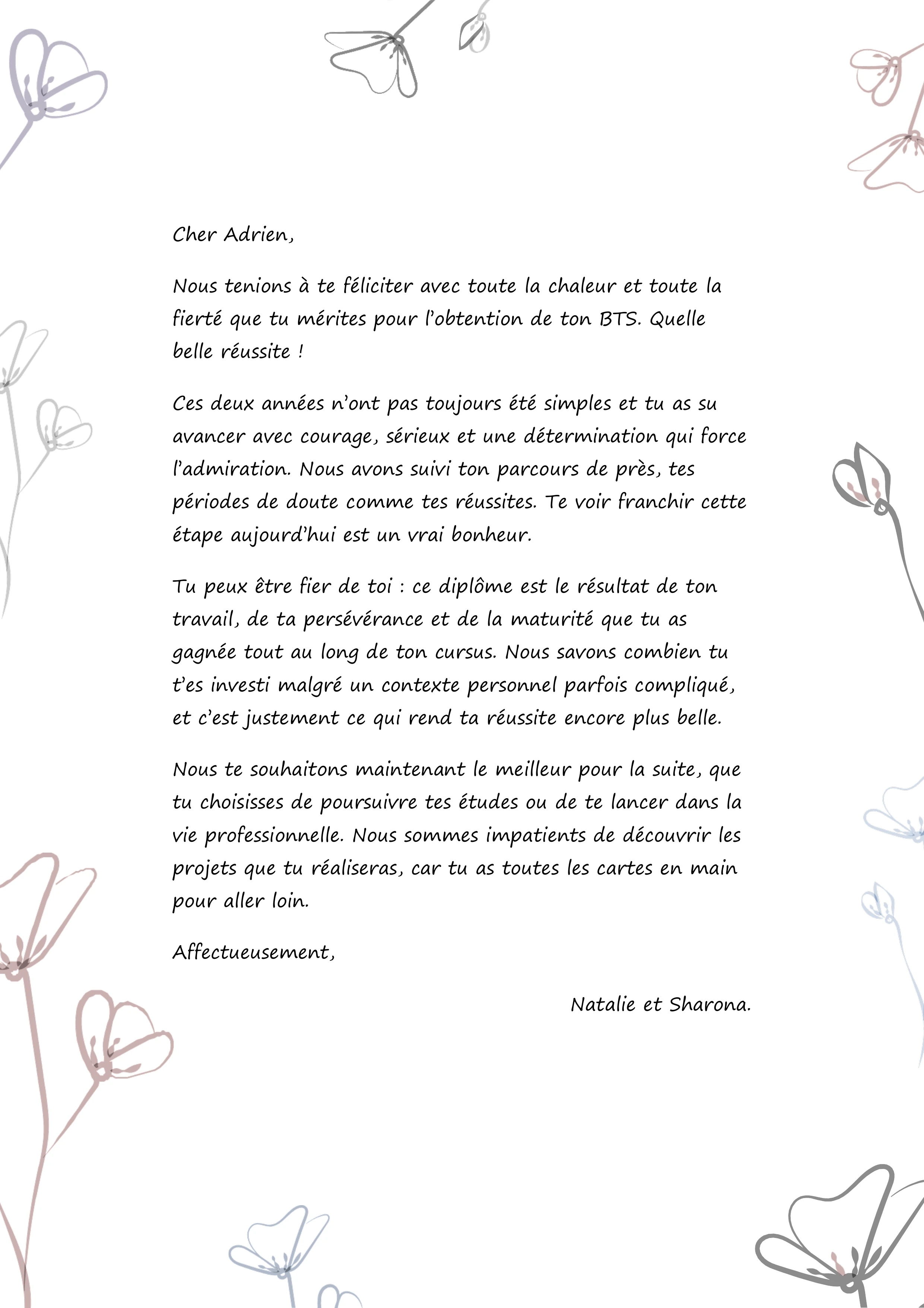 Nous tenions à te féliciter avec toute la chaleur et toute la fierté que tu mérites pour l’obtention de ton BTS. Quelle belle réussite !