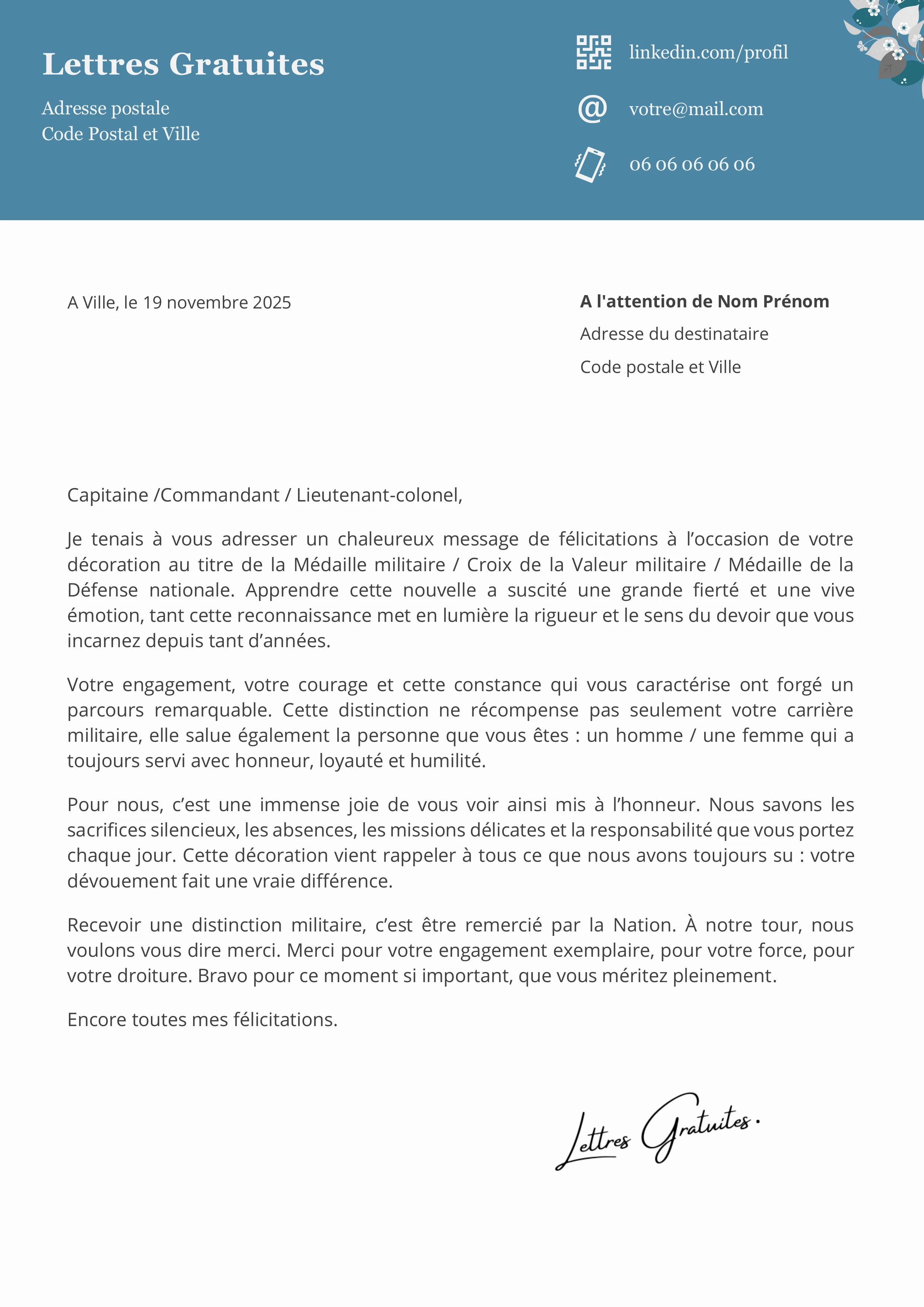 Que l'on soit un sous-officier de l'armée, un soldat de deuxième classe, un ancien combattant ou un colonel à la retraite, une décoration militaire est une distinction bien souvent méritée qui honore ses bons états de service, pour avoir rendu un service exceptionnel à la nation ou qui rend hommage à l'ensemble d'une carrière. Voici un message de félicitation qui mêle respect et sincérité.