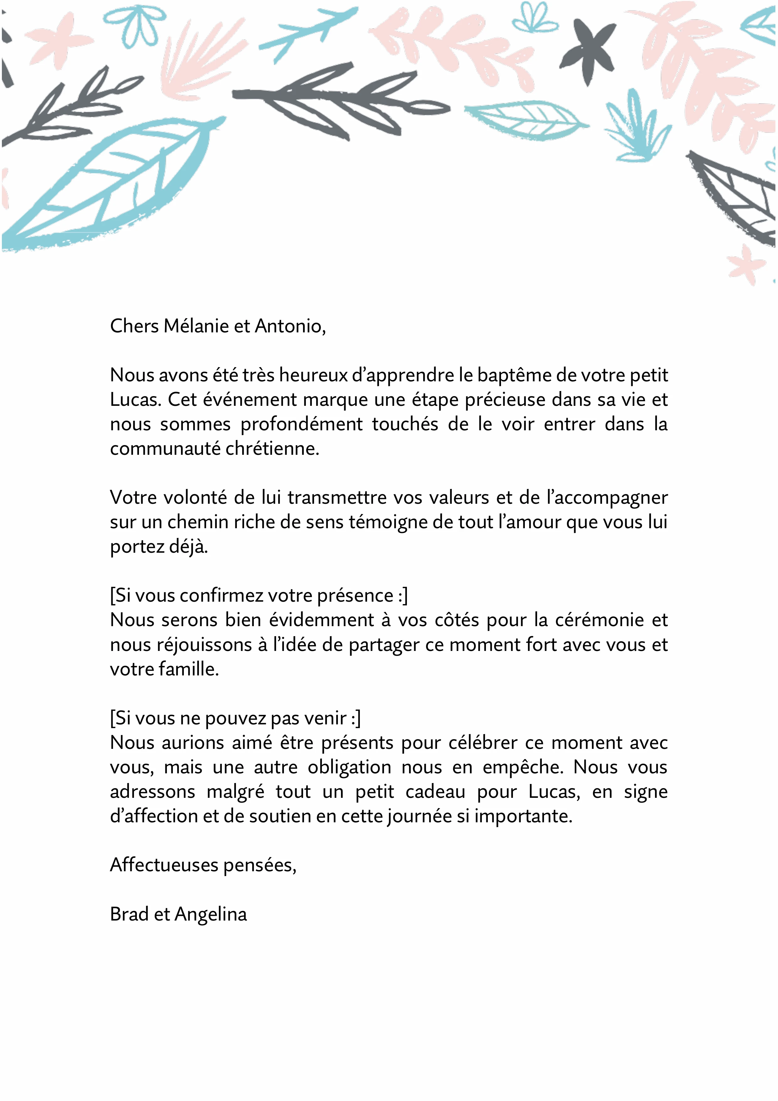 Quand on reçoit une invitation pour un baptême, il est courant de répondre avec un message mêlant félicitations, quelques mots personnels pour les parents et l’enfant, ainsi qu’une confirmation de sa présence ou l’annonce, avec délicatesse, de son absence. Notre exemple de texte ci-dessous s'adapte très bien aux deux situations.
