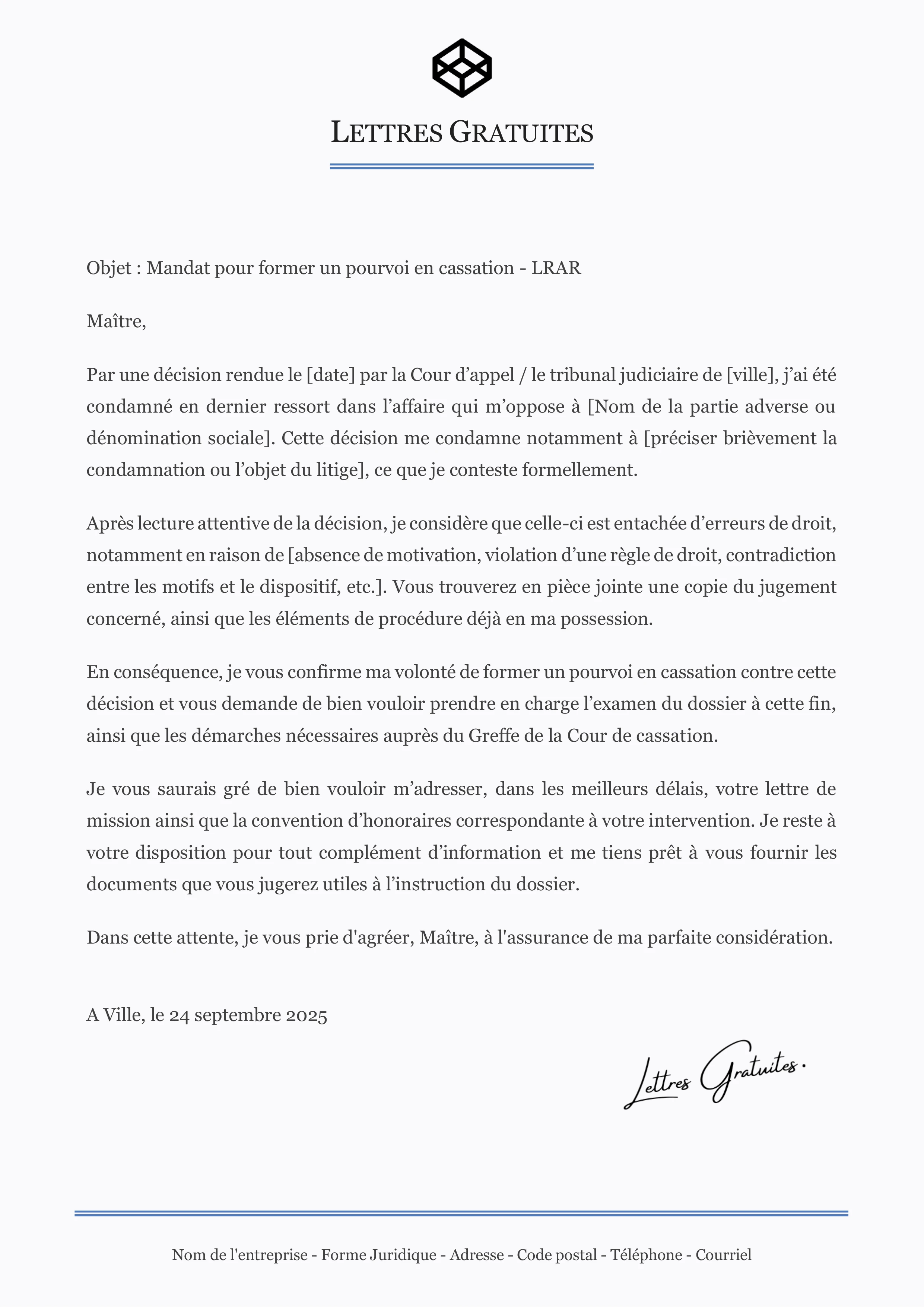Former un pourvoi en cassation en matière civile impose le recours à un avocat au Conseil d’État et à la Cour de cassation, également appelé « avocat aux Conseils ». Le modèle de lettre ci-dessous illustre la démarche à suivre lorsqu’un justiciable mandate un tel avocat pour contester un jugement rendu en dernier ressort par une juridiction d’appel ou de première instance. Notre exemple mentionne les éléments essentiels de la décision de justice contestée, les motifs de droit invoqués et la demande expresse de formalisation du mandat.