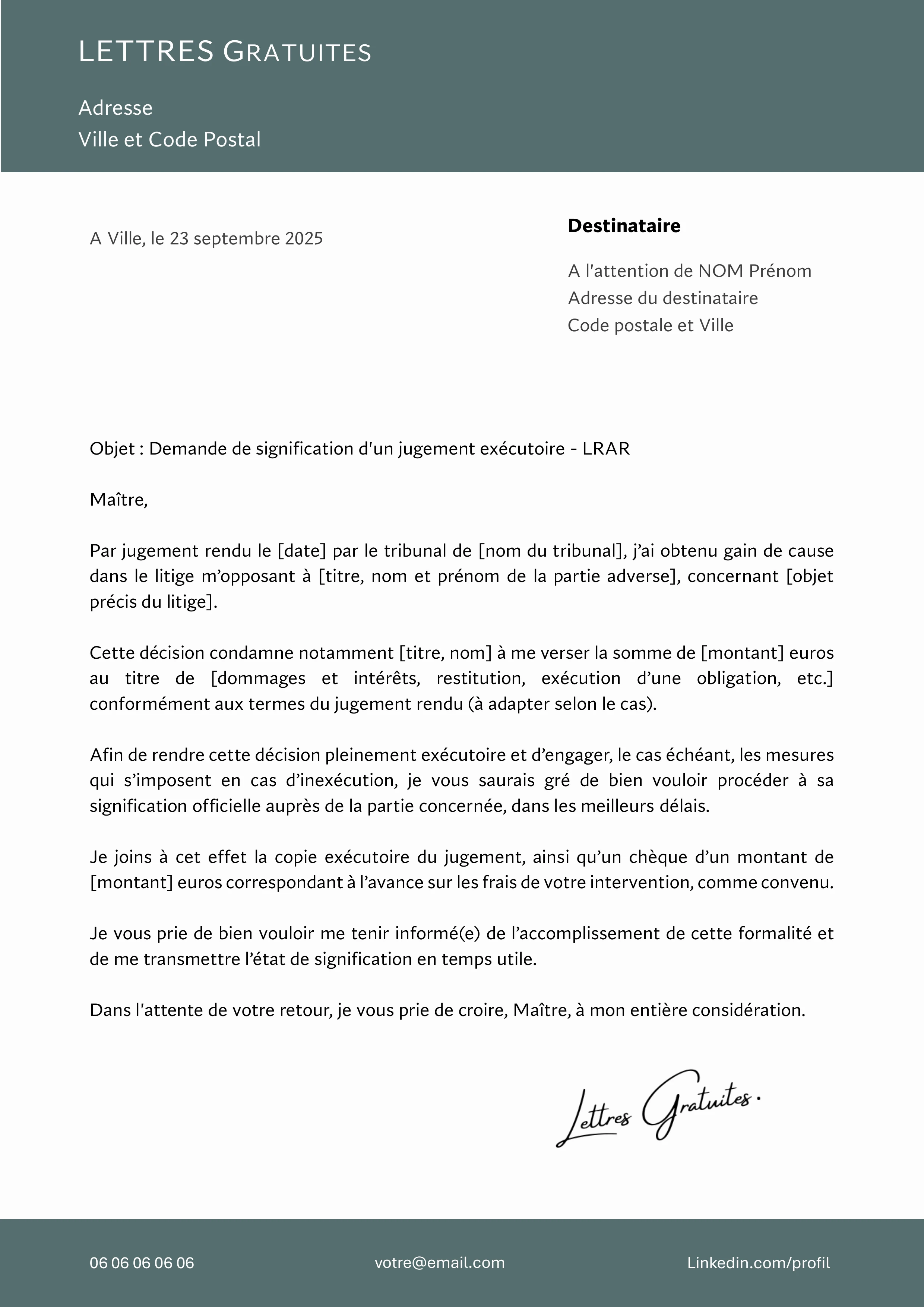 Ce modèle de lettre permet de mandater un commissaire de justice pour la signification officielle d’un jugement rendu en votre faveur. La signification est une étape indispensable pour porter la décision à la connaissance de la partie adverse et enclencher la procédure d’exécution forcée si nécessaire. Notre exemple est adaptable à diverses situations civiles ou commerciales et facilite la formalisation du mandat dans le respect des usages.