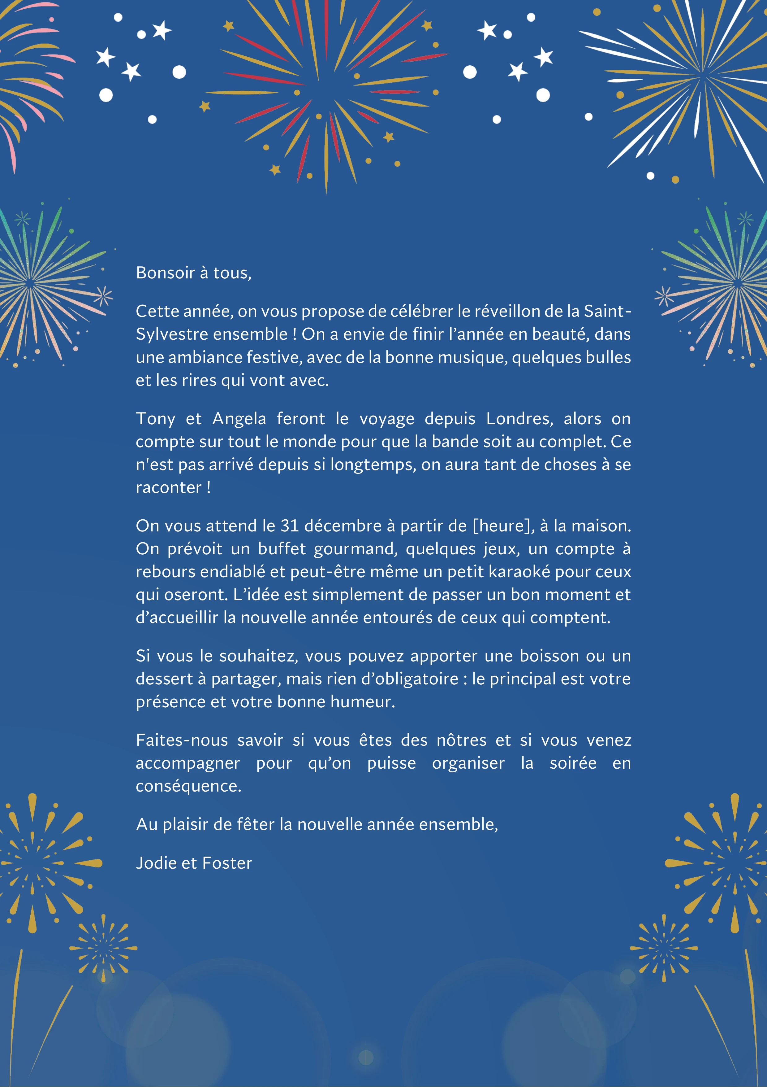 Ce texte est parfait pour inviter frères, sœurs et proches à partager le repas de Noël en famille. Le ton est convivial et authentique, avec une touche d’humour léger et beaucoup de bienveillance. Il rappelle l’importance de se retrouver à cette période, tout en facilitant l’organisation du réveillon. Idéal pour un message adressé à une fratrie ou à un cercle familial proche (cousins, oncles et tantes).