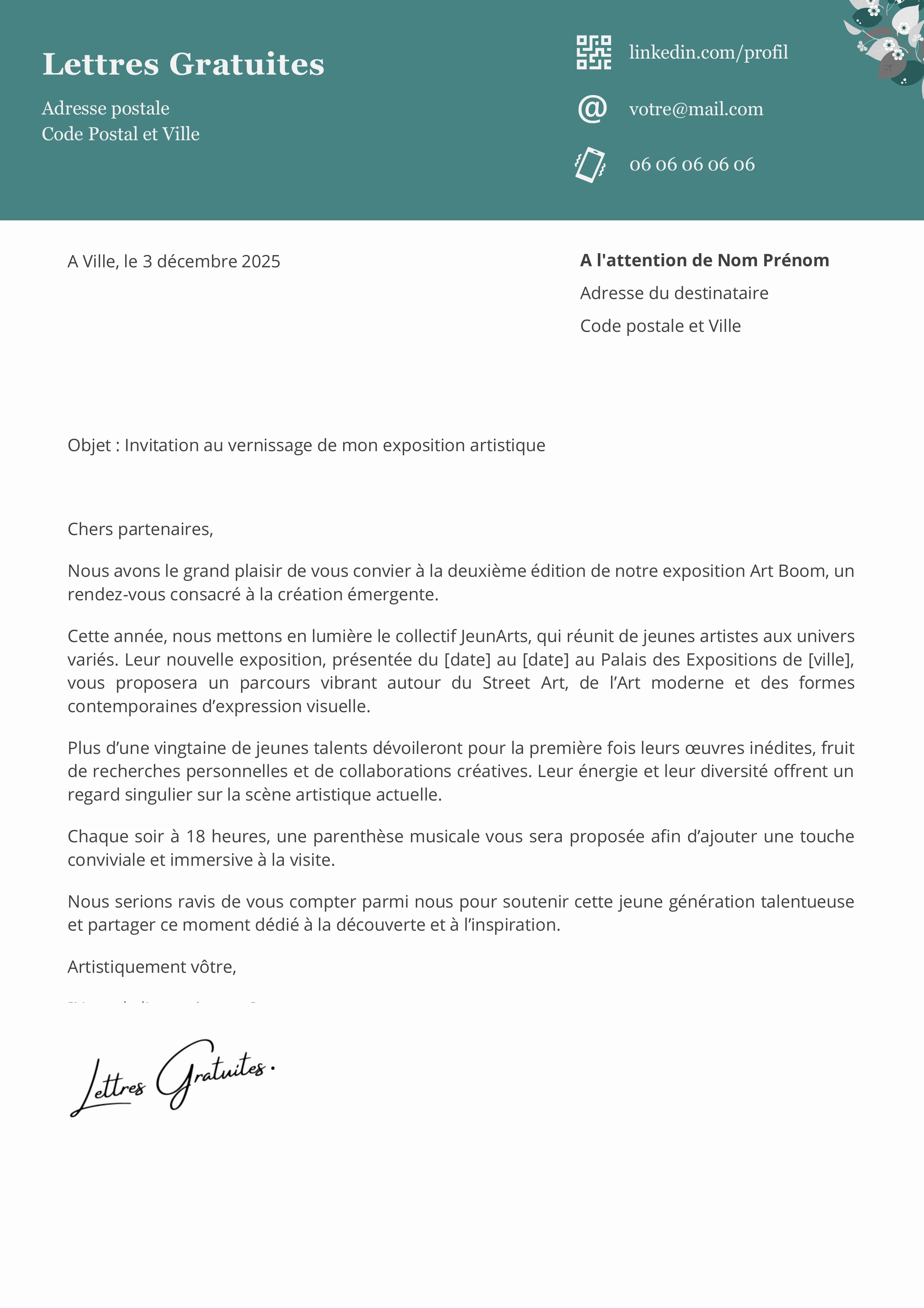Pour cela, vous pouvez vous inspirer de notre modèle de lettre d'invitation pour convier des connaissances à une exposition d'art où nous avons choisi le prisme d'une soirée caritative dont les bénéfices seraient reversés à une association. Nous vous proposons aussi un deuxième exemple moins formel pour assister à une exposition pour de jeunes artistes. Si vous souhaitez une invitation avec un texte personnalisé de qualité professionnelle, n'hésitez pas à prendre contact avec notre écrivain public (devis gratuit et sans engagement).