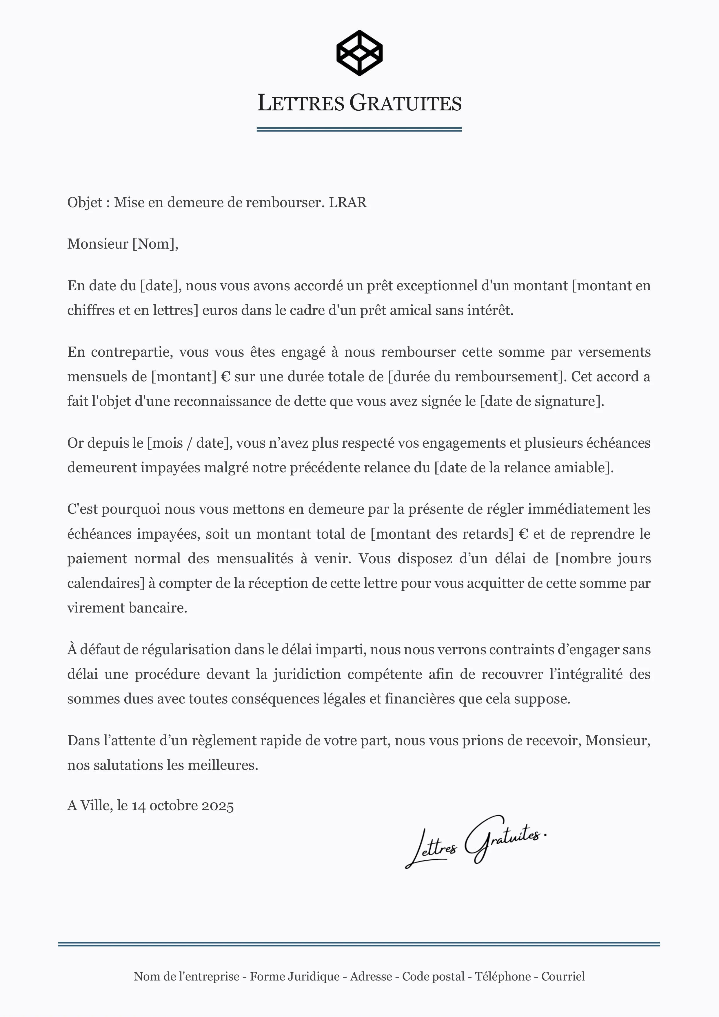 La lettre suivante permet de relancer poliment une personne qui tarde à rembourser une dette d’argent sans engager encore de procédure officielle. Elle constitue une première démarche amiable afin de rétablir le dialogue et rappeler les termes convenus dans la reconnaissance de dette ou l’accord de prêt. Le modèle se prête très bien à un prêt entre particuliers ou familial conclu sous seing privé.