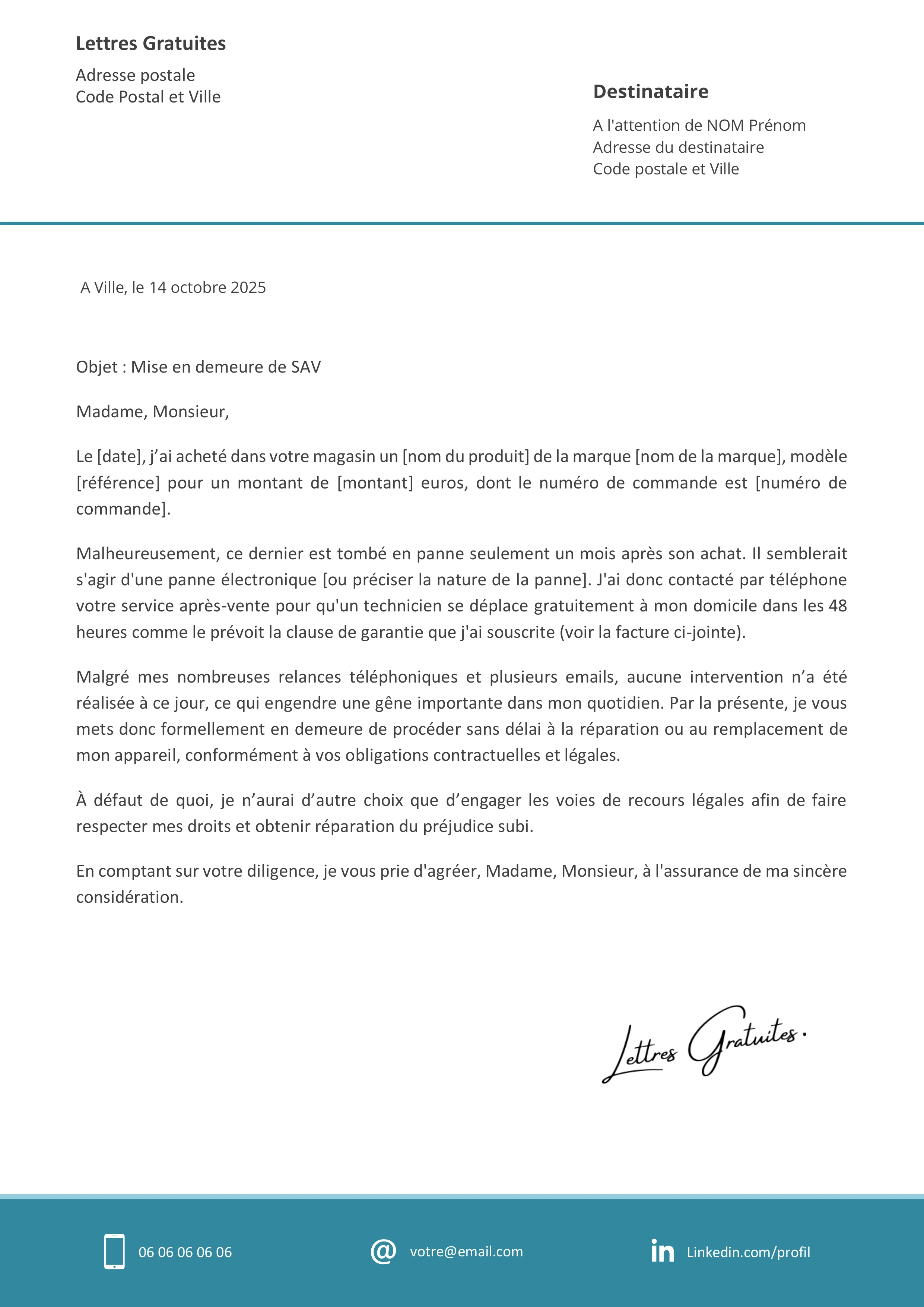 Malgré mes nombreuses relances téléphoniques et plusieurs emails, aucune intervention n’a été réalisée à ce jour, ce qui engendre une gêne importante dans mon quotidien. Par la présente, je vous mets donc formellement en demeure de procéder sans délai à la réparation ou au remplacement de mon appareil, conformément à vos obligations contractuelles et légales.