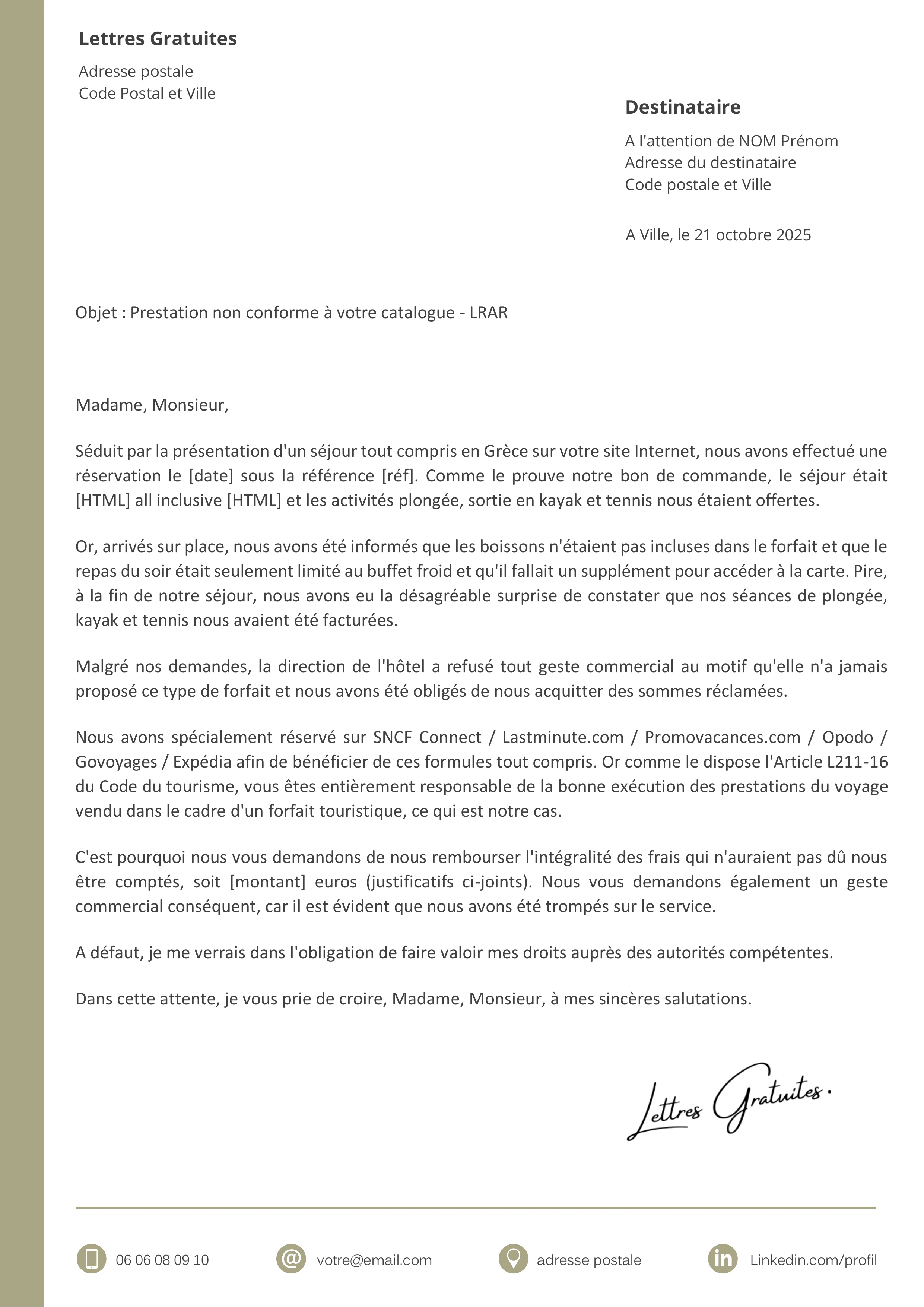 Dans ce but, nous vous proposons ces différents modèles de lettre pour obtenir le remboursement d'un voyage non conforme ou demander une indemnisation pour le préjudice subi. En cas de litige persistant avec l'agence de voyages, le site de réservation ou le tour opérateur, il sera possible d'écrire au médiateur tourisme et voyage, voire de saisir les tribunaux afin demander des dommages et intérêts.