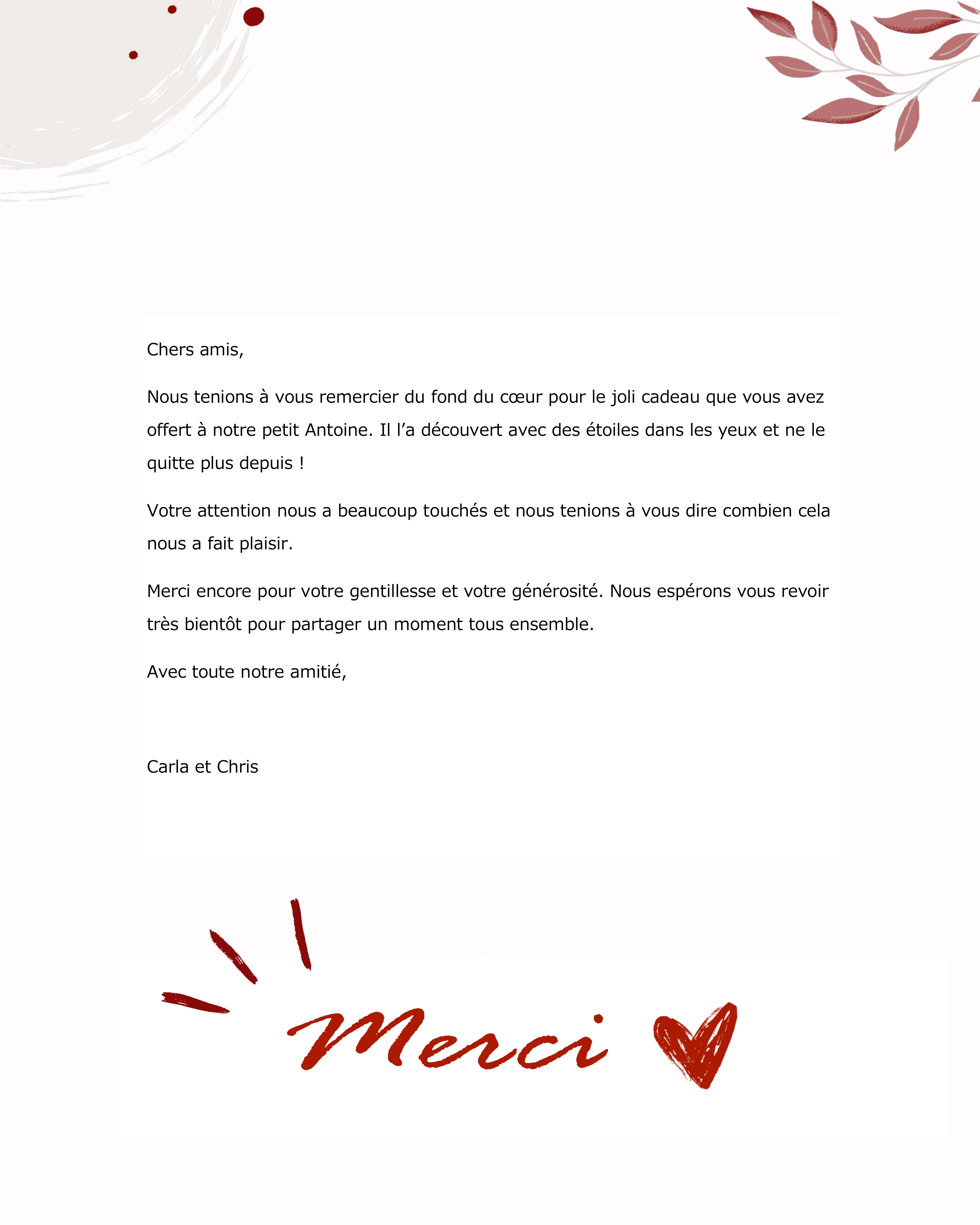Ce premier exemple convient parfaitement pour remercier des amis proches qui ont offert un cadeau à votre enfant à l’occasion d’un anniversaire, d’une fête ou simplement par amitié. Le ton est chaleureux, simple et sincère, idéal pour un message envoyé par mail ou carte de remerciements.