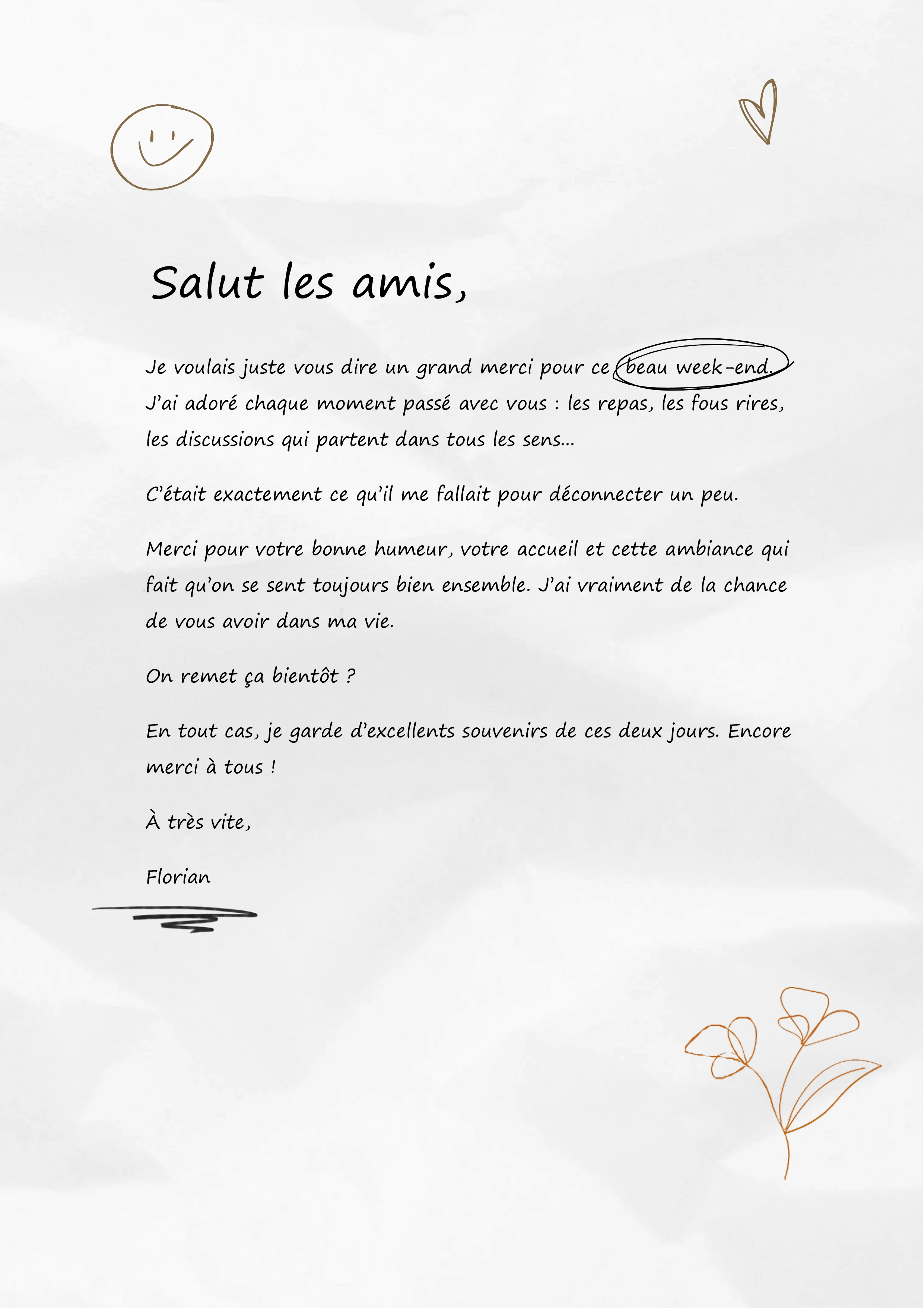 Je voulais juste vous dire un grand merci pour ce beau week-end. J’ai adoré chaque moment passé avec vous : les repas, les fous rires, les discussions qui partent dans tous les sens... C’était exactement ce qu’il me fallait pour déconnecter un peu.