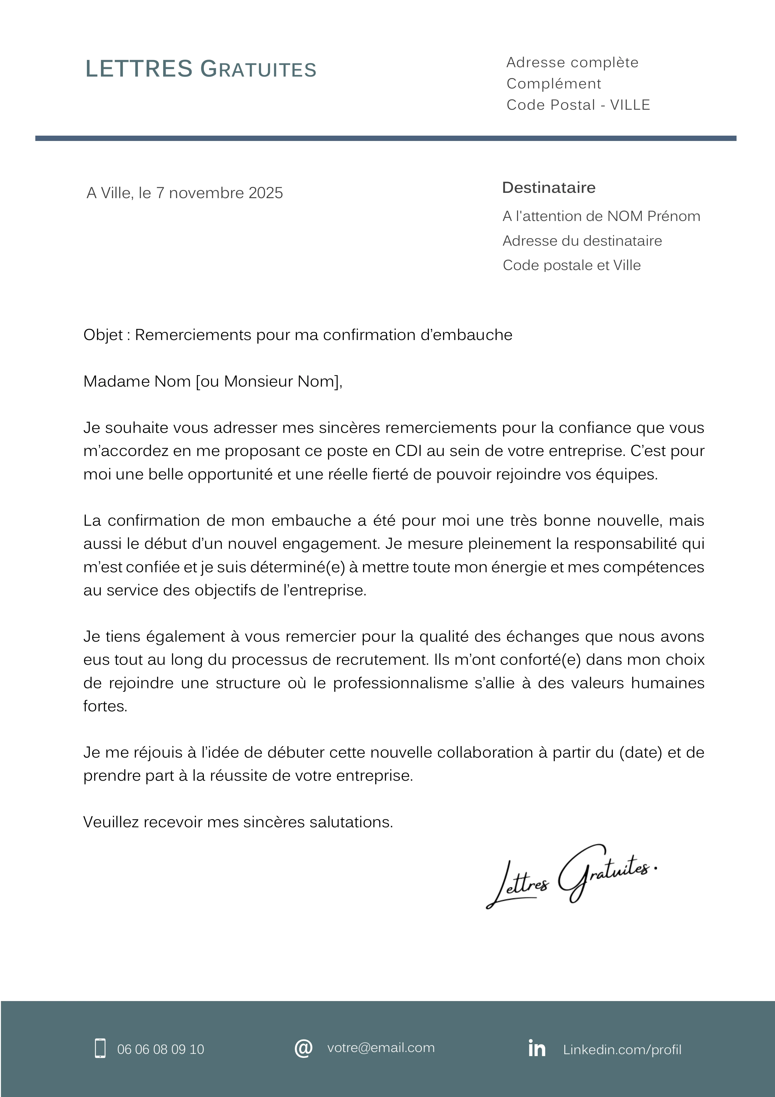 La confirmation de mon embauche a été pour moi une très bonne nouvelle, mais aussi le début d’un nouvel engagement. Je mesure pleinement la responsabilité qui m’est confiée et je suis déterminé(e) à mettre toute mon énergie et mes compétences au service des objectifs de l’entreprise.