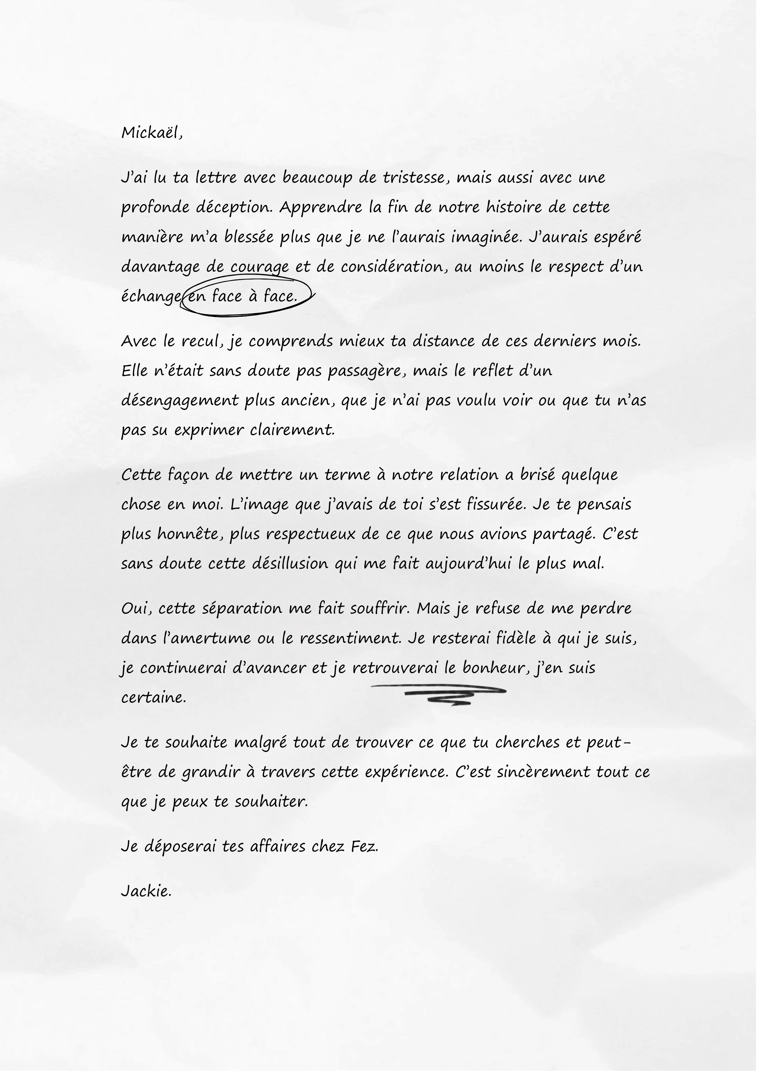 J’ai lu ta lettre avec beaucoup de tristesse, mais aussi avec une profonde déception. Apprendre la fin de notre histoire de cette manière m’a blessée plus que je ne l’aurais imaginée. J’aurais espéré davantage de courage et de considération, au moins le respect d’un échange en face à face.