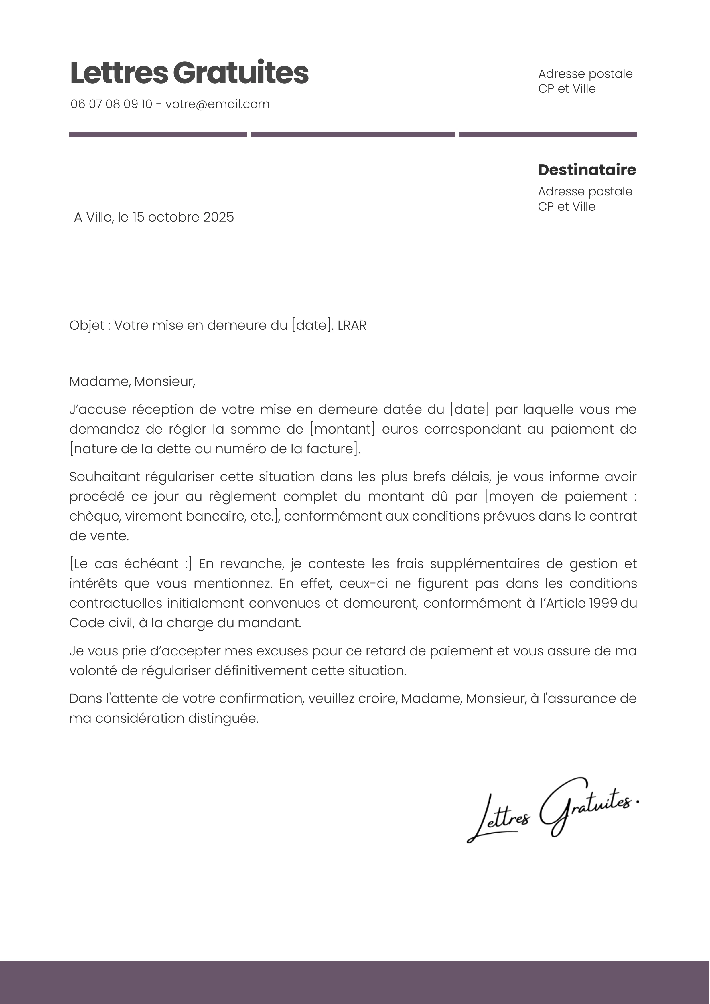 Objet : Votre mise en demeure du [date]. LRAR