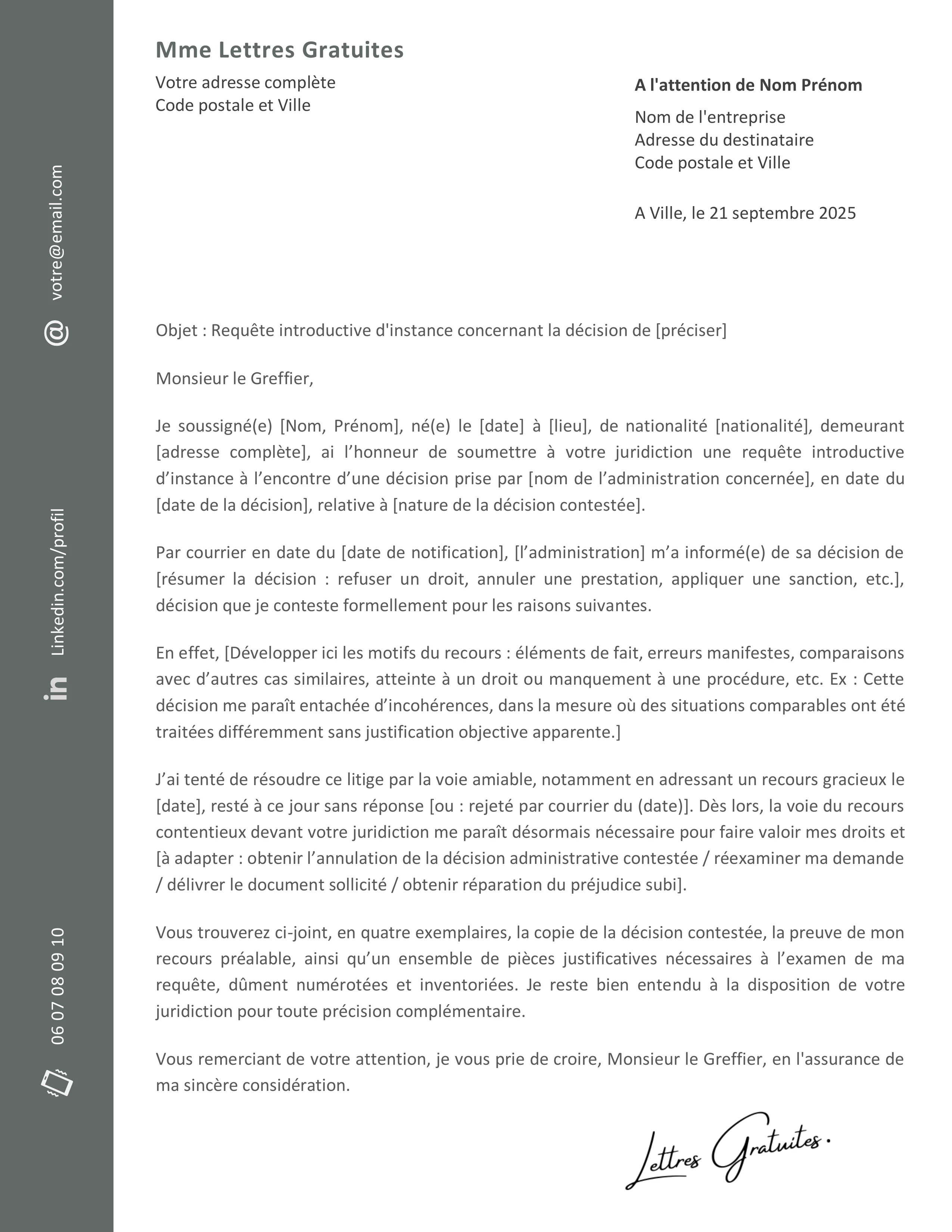 Objet : Requête introductive d'instance concernant la décision de [préciser]