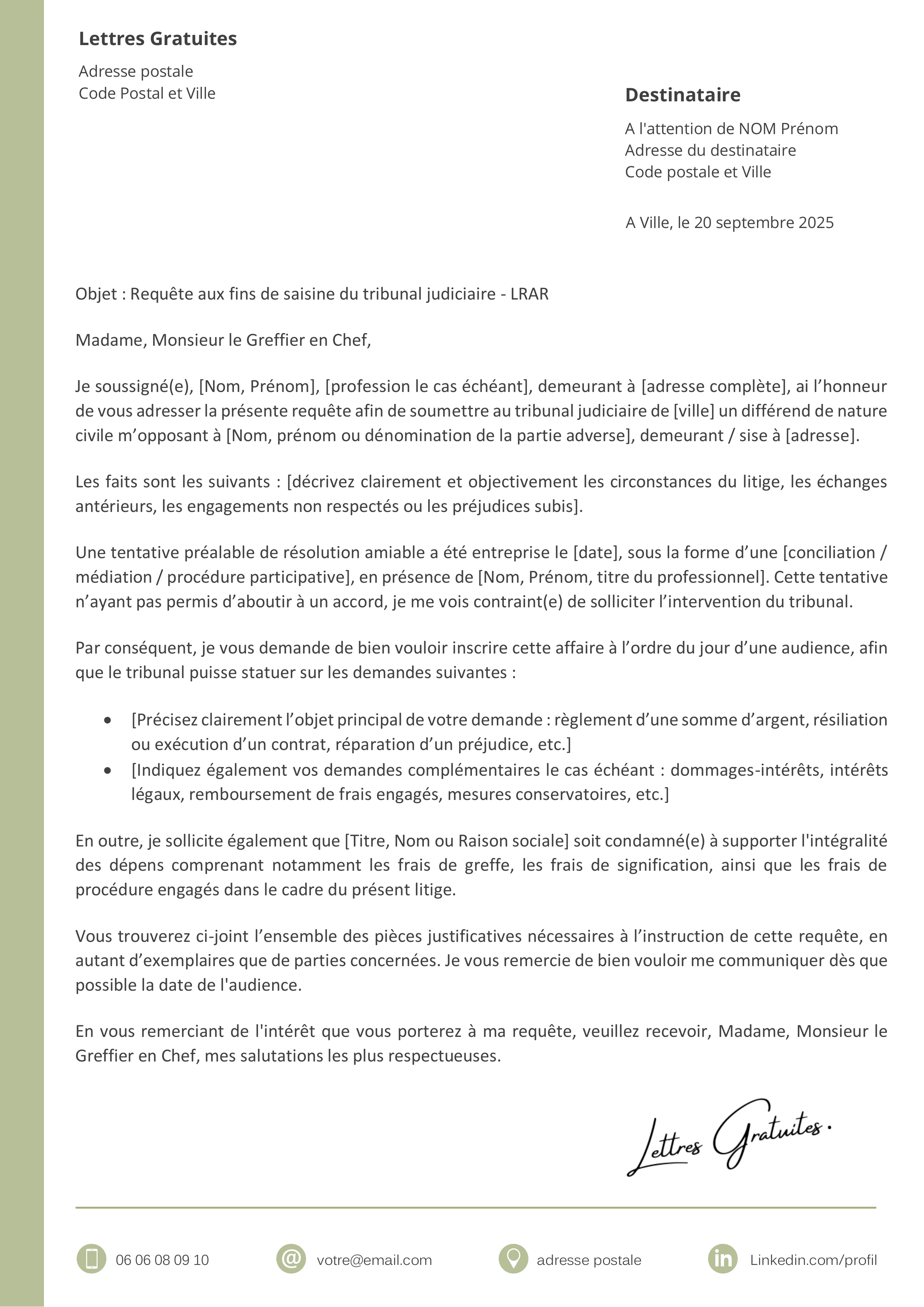 Cette lettre permet à un particulier de saisir le tribunal judiciaire par requête écrite dans le cadre d’un litige civil n’excédant pas 5 000 €. Le demandeur y expose les faits, les démarches amiables entreprises, ainsi que les demandes qu’il souhaite voir tranchées par le juge. Le modèle ci-dessous peut être adapté à une large variété de situations comme un impayé, un préjudice matériel ou moral, un désaccord contractuel ou une demande d’indemnisation par exemple.
