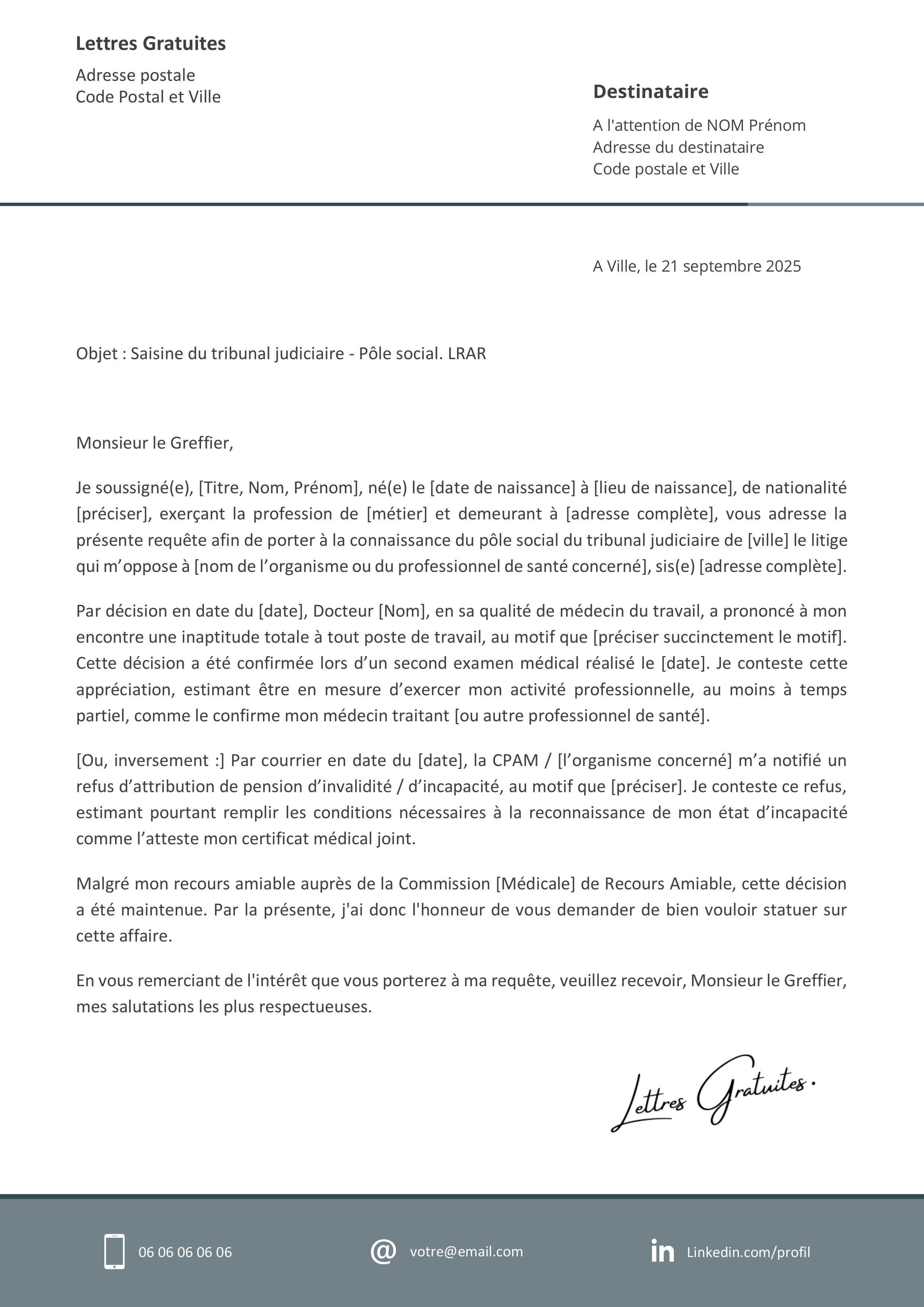 Ce premier modèle de lettre permet de saisir le pôle social du tribunal judiciaire à la suite d’un litige portant sur une décision d’inaptitude ou d’invalidité au travail émise par un médecin du travail. Il peut s’agir, par exemple, d’un salarié ou d’un assuré social estimant que son état de santé ne justifie pas une mise en invalidité totale, ou au contraire qu’un refus de reconnaissance d’incapacité est injustifié. La lettre détaille les faits, les démarches préalables effectuées, et expose les éléments médicaux à l’appui de la contestation.