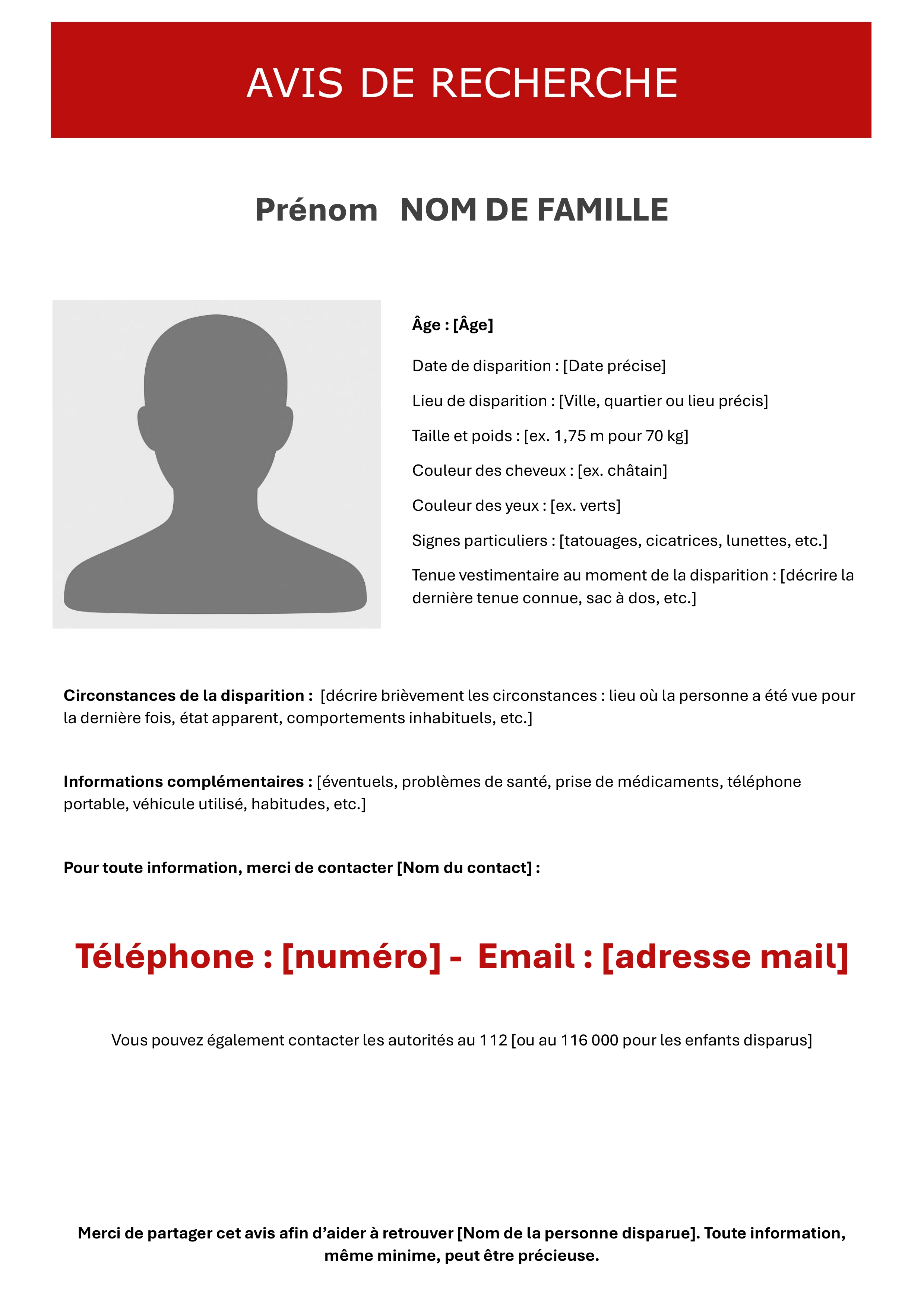 [Prénom] n’est pas rentré(e) à son domicile et n’a donné aucun signe de vie, ce qui est totalement inhabituel compte tenu de nos échanges réguliers. Tous les moyens habituels de communication sont restés sans réponse : appels téléphoniques, SMS, messages sur les réseaux sociaux.