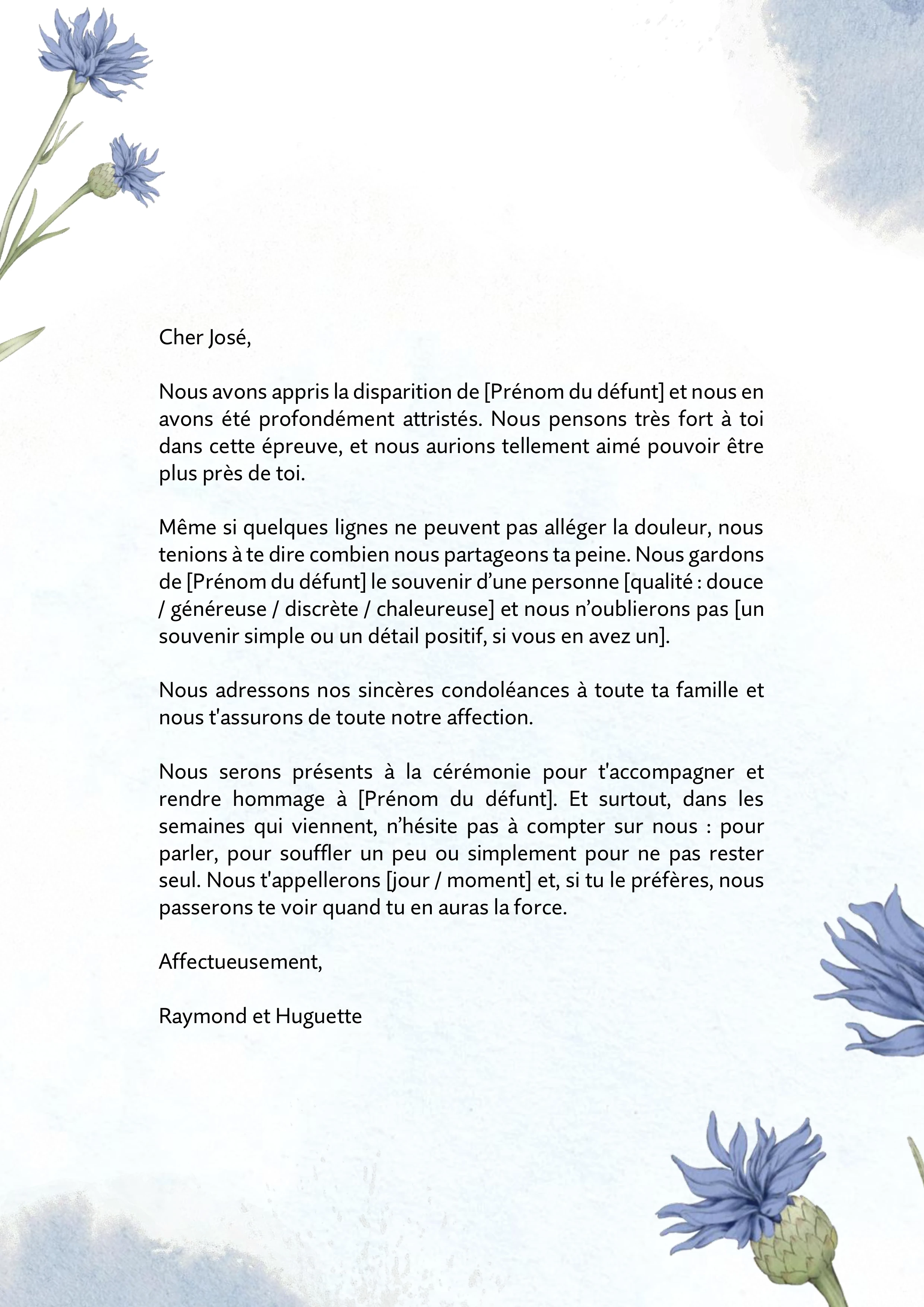 Même si quelques lignes ne peuvent pas alléger la douleur, nous tenions à te dire combien nous partageons ta peine. Nous gardons de [Prénom du défunt] le souvenir d’une personne [qualité : douce / généreuse / discrète / chaleureuse] et nous n’oublierons pas [un souvenir simple ou un détail positif, si vous en avez un].