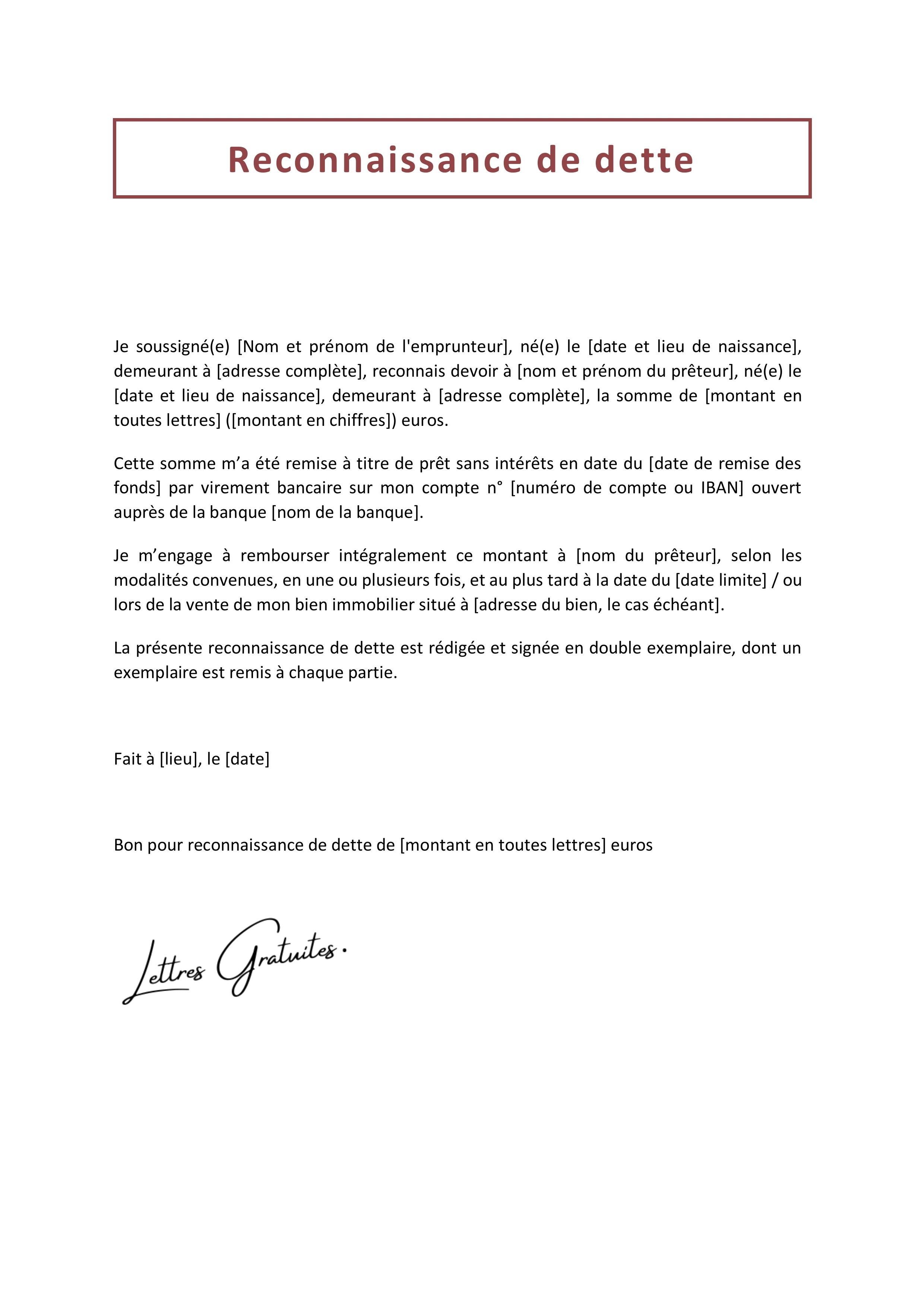 Je soussigné(e) [Nom et prénom de l'emprunteur], né(e) le [date et lieu de naissance], demeurant à [adresse complète], reconnais devoir à [nom et prénom du prêteur], né(e) le [date et lieu de naissance], demeurant à [adresse complète], la somme de [montant en toutes lettres] ([montant en chiffres]) euros.