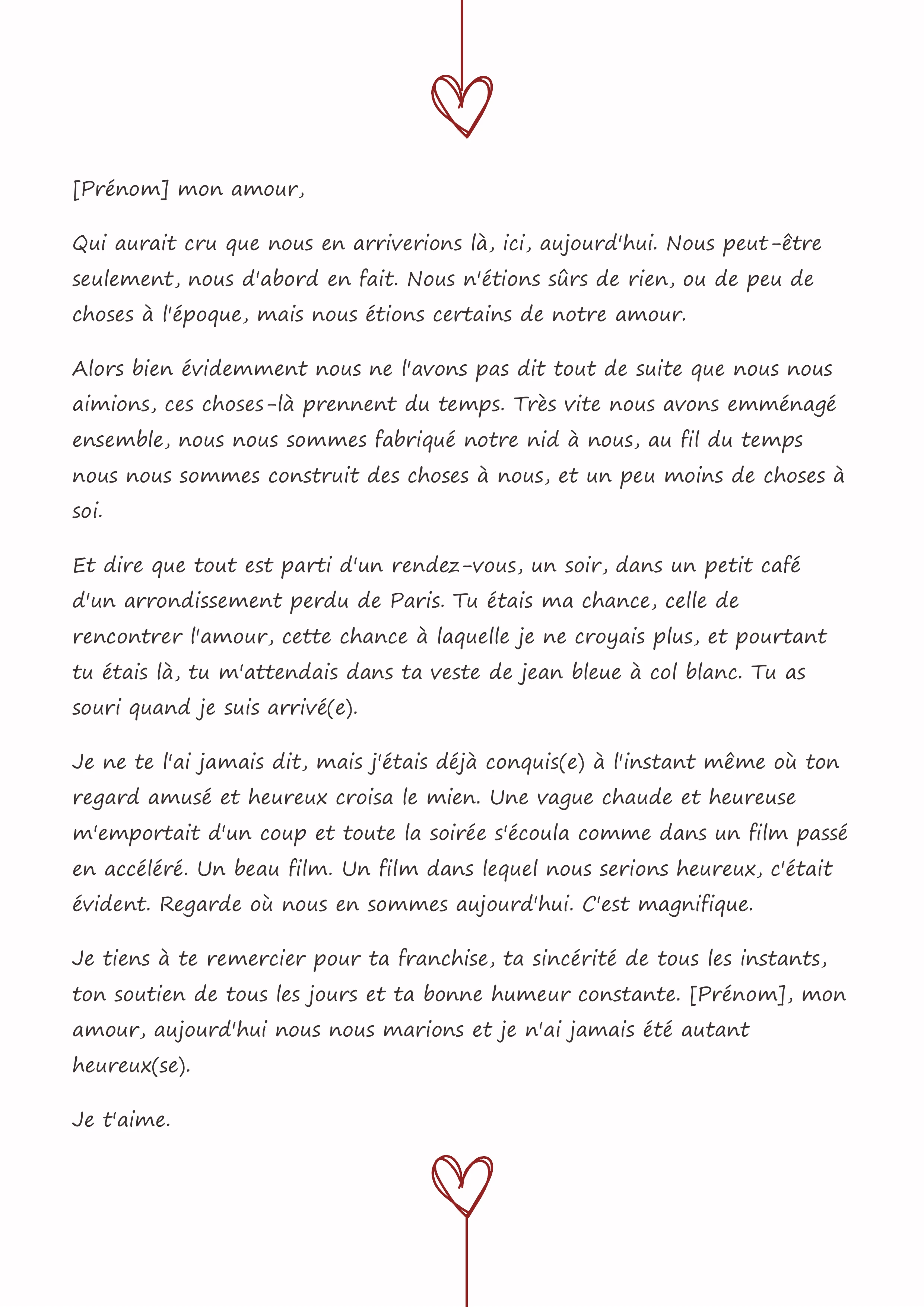 Ce modèle convient à celles et ceux qui souhaitent raconter leur histoire avec sensibilité, en revenant sur les débuts, les instants fondateurs et la force du lien qui s’est construit au fil du temps. Il met en avant l’évidence de l’amour, la reconnaissance pour le chemin parcouru et la joie d’arriver au jour du mariage. Si vous cherchez des vœux personnels, doux et authentiques, ce texte constitue une base idéale à personnaliser.
